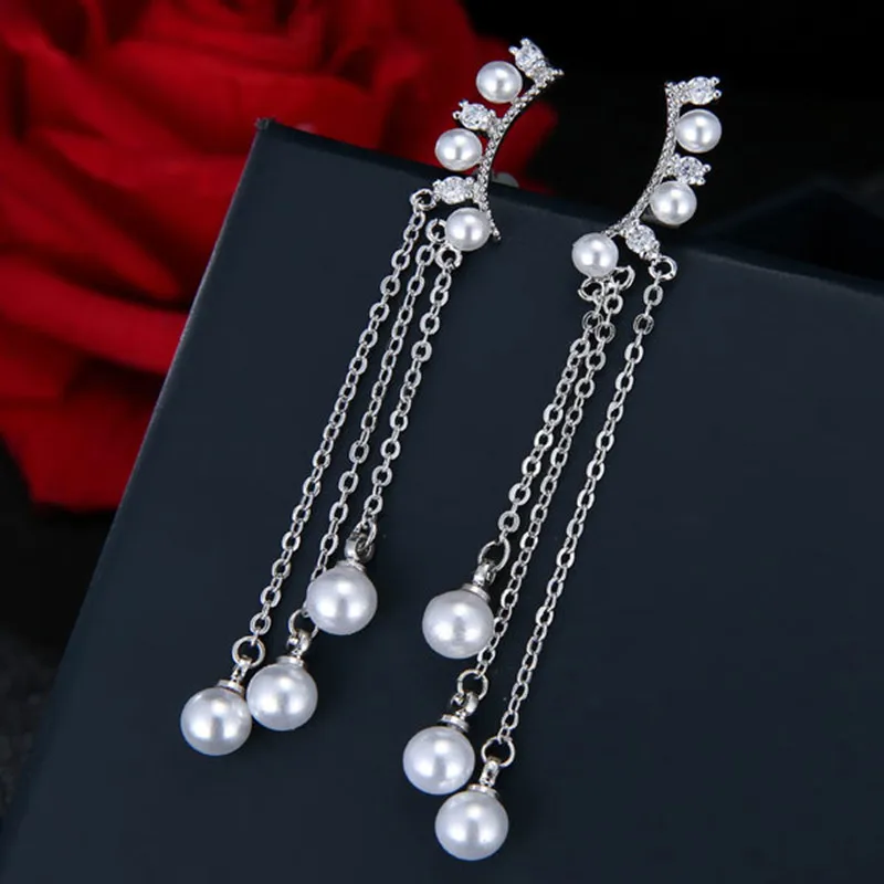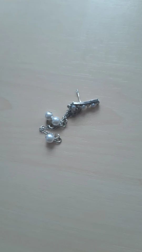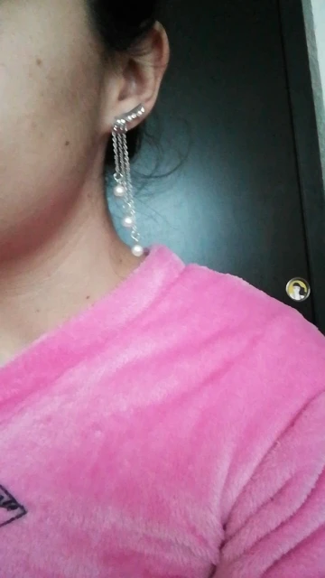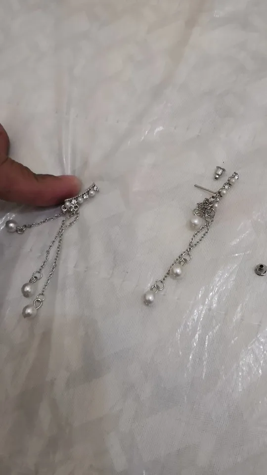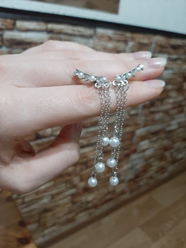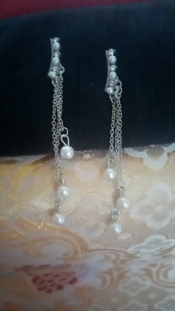 Los aretes son bonitos. Son de un material no muy bueno que se oxida fácilmente. El peso de las perlas hace que el arete se levante y no se quede en horizontal como en la foto. Se ve bien. Sería mejor que fueran más baratos por éstas características que dije anteriormente.