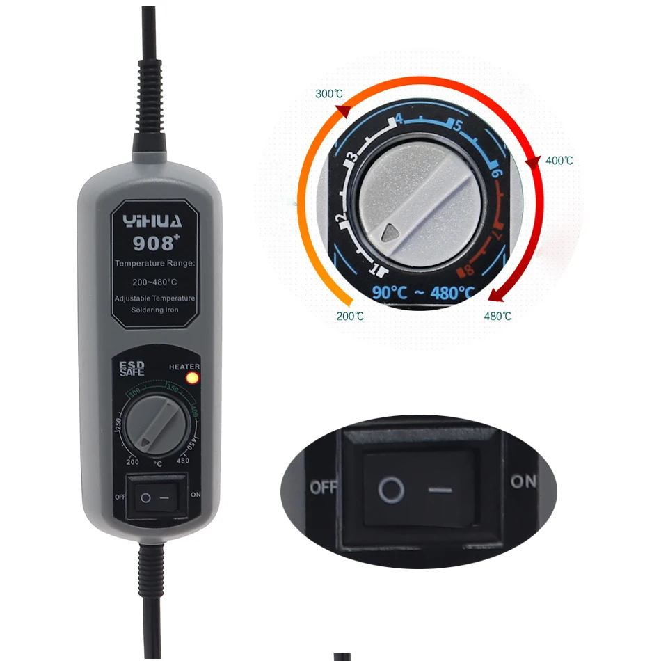 Напряжение: 110 В переменного тока 220 В/50 Гц 60 ГцМощность: 60 ВтДиапазон температур: 100 - 480 ℃Тип вилки: штепсельная вилка европейского стандартаРабочая температура: 0 - 40 ℃Температура хранения: - 20 - 80 ℃Объем хранения: 35% - 45% Особенности:1. Все преимущества 9081.1 портативный Антистатический нагреваемый Утюг, контроль температуры с использованием новейшей усовершенствованной схемы контроля температуры, точный контроль температуры.1,2 нагревательный сердечник изготовлен из высококачественных и прочных материалов, длительный срок службы.1,3 ручка с новыми высокотемпературными материалами и защитой окружающей среды, в то время как стальная трубка Ручка и тепло увеличивает температуру в изоляционном кольце, эффективно блокируя передачу тепла и улучшая использование комфорта.Сохранены, с добавлением цифровой светодиодный дисплей, что позволяет пользователям непосредственно контролировать температуру и делает пайки проще.2. Функция отображения температуры по Цельсию/Фаренгейту: для удовлетворения рыночного спроса в разных регионах компания разработала режим отображения температуры.3. Паяльник оснащен функцией сна, которая может быть установлена за 10 минут, он без присмотра и не используется после 10 минут, затем он войдет в режим сна, чтобы предотвратить окисление паяльника и эффективно продлить срок службы головки паяльника, сохраняя при этом Энергосбережение и защиту окружающей среды.4. Функция блокировки температуры