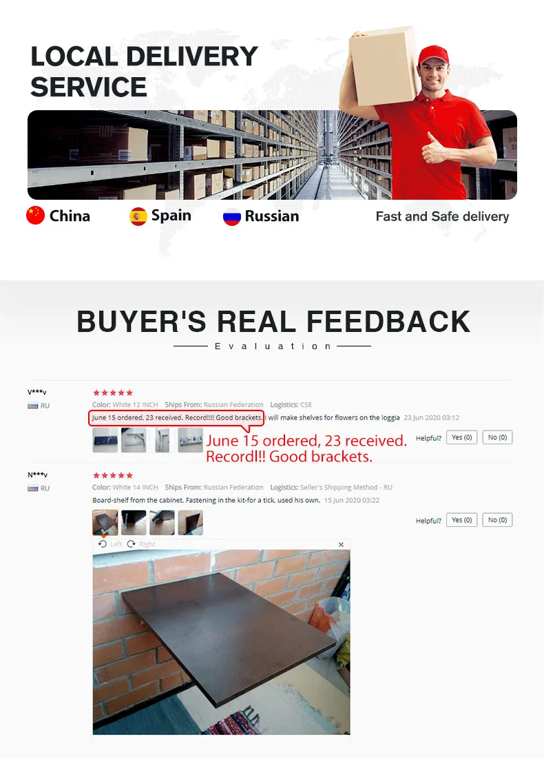 Архибыстрая доставка!!! На четвертый день доставили курьером до двери! Кронштейны отличные, крепкие, беленькие, как раз на балконный столик! Я очень довольна сервисом магазина и товаром! К покупке рекомендую однозначно!!! Заказала для столика из кухонной столешницы, размер 60х40 см, буду пить кофе на балконе))).