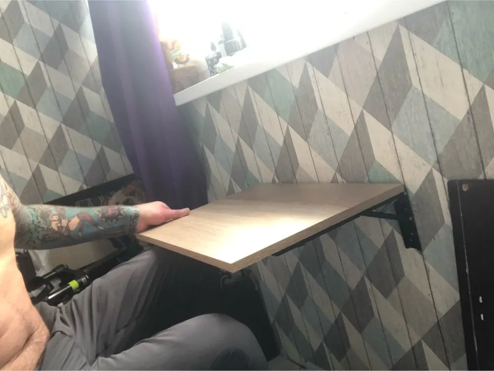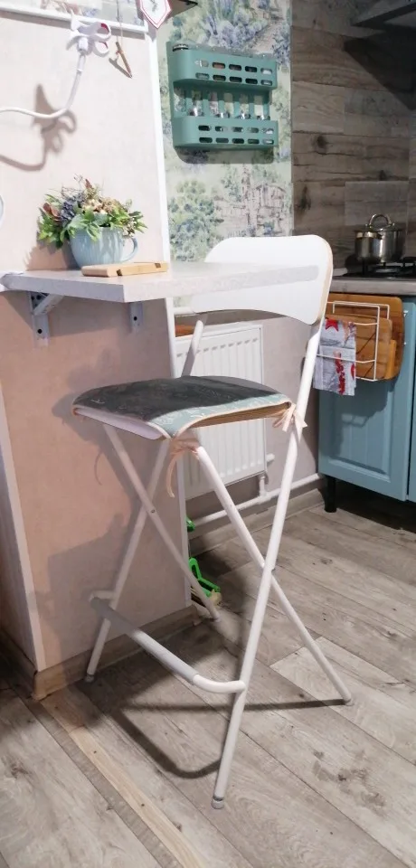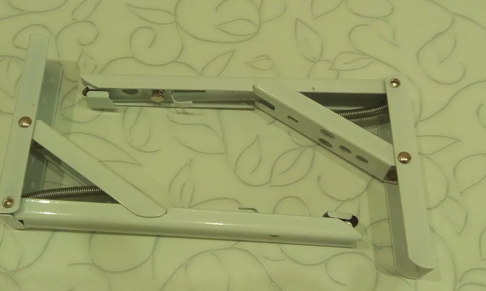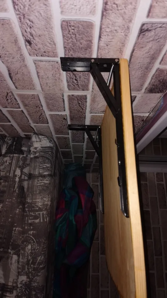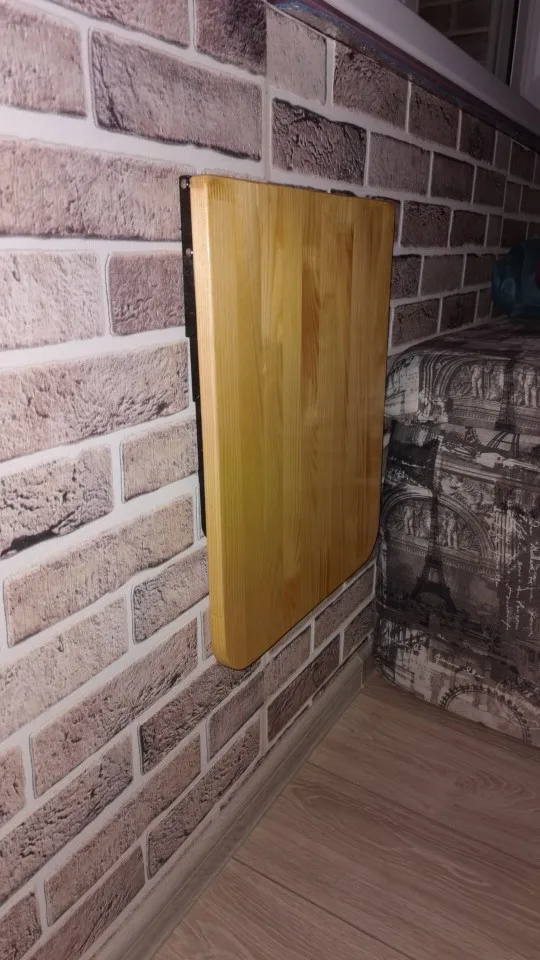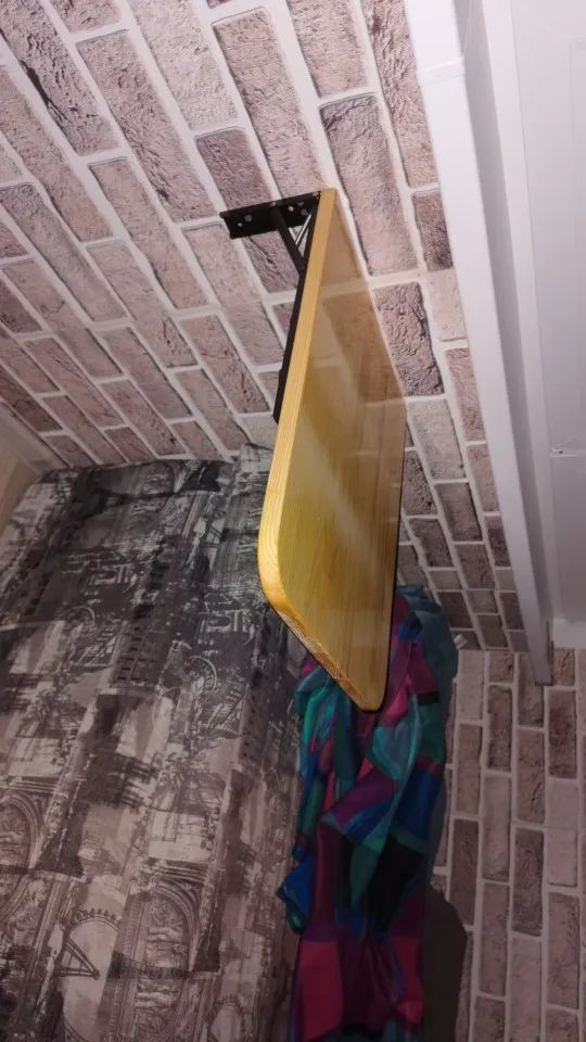 Кронштейны установили на даче, в бытовке. Купили мебельный щит для столешницы. И тут началось. Вроде, всё измерили точно, но столешница сразу не пожелала закрываться вровень со стеной. Оказалось, что мебельный щит слегка перекошен, да и стенка из вагонки - тоже неровная. Пересверлили отверстия у одного кронштейна для крепления столешницы - стол стал складываться нормально. Заявлено, что данный размер кронштейнов выдерживает 65 кг - вот это очень спорный момент: я бы даже опираться на такой столик побоялась. Решили, что нужны дополнительные усилители кривоватого чудо-щита и дополнительный упор (вдруг, кто-то рискнёт и обопрётся?). А так, для бытовки - нормально.