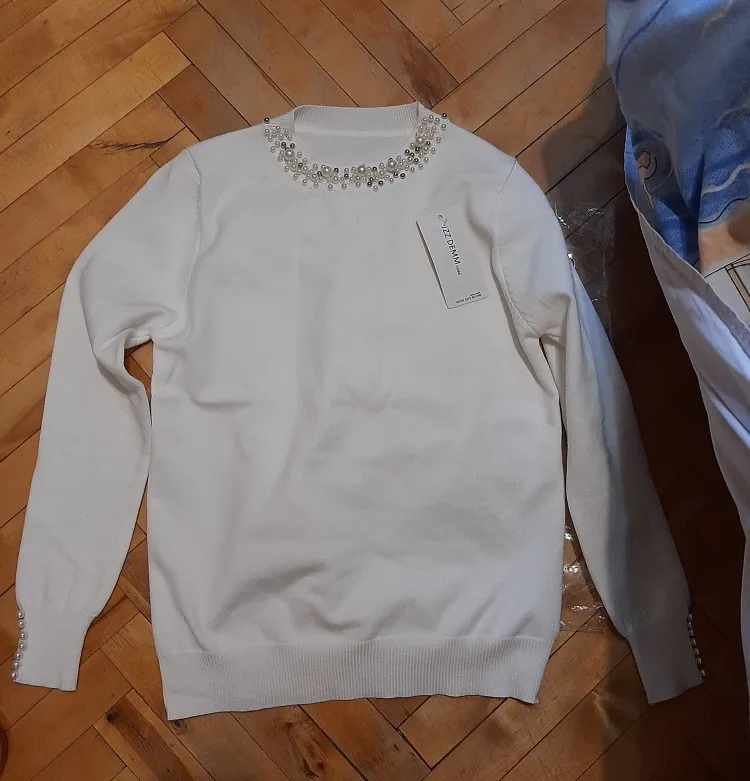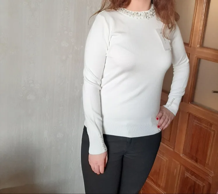 На размер s/m (85-65-89) джемпер подошел отлично. Ткань плотная, бусинки не приклеены.