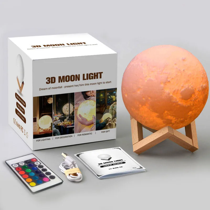 Товар: лампа 3D Moon Цвет излучения: белый и теплый белый или разноцветный Материал: PLA Размер: диаметр 8 см/9 см/10 см/12 см/13 см/14 см/15 см/18 см/20 см/22 см/24 см Входное напряжение: 5 В постоянного тока Мощность: 0,5 W Источник питания: литиевая батарея (встроенный) Емкость литиевой батареи: 250 мАч Лунный светильник с использованием времени: лунный Ночной светильник очень длинный, полная зарядка займет около 3 часов, ночная лампа с 3D-принтом может использоваться через 5-20 часов после полной зарядки (иногда зависит от яркости) Тип переключателя: сенсорный Светильник источник света: светодиодный светильник источник (желтый/белый светильник Переключайте свободно, регулируемая яркость) Как использовать: прикоснитесь к нижнему интерфейсу, чтобы включить/выключить светильник и изменить цвет, нажмите и удерживайте кнопку для регулировки яркости Применение: освещение, Декор, подарки