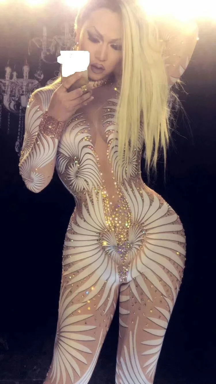 Женский комбинезон для ночного клуба, с узором, белые эластичные колготки, со стразами, для певицы, боди для танцовщицы