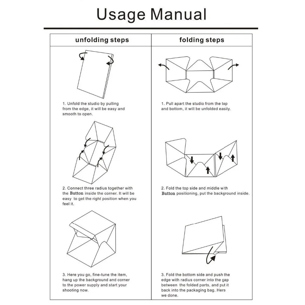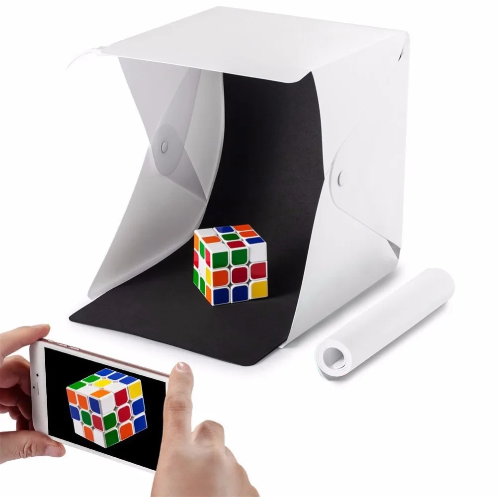 Складной портативный лайтбокс-студия-это революционная мини-фотостудия, которая складывается до размера листа бумаги формата А4. Вы можете носить его прямо внутри сумки и брать с собой куда угодно. Когда приходит время сделать фотографию, разверните кубики, И вы будете иметь достаточно большим пространством для сфотографировать товар до 8,9 дюймов 9 дюймов на 9,5 дюйма по размеру.