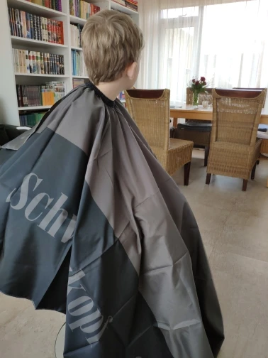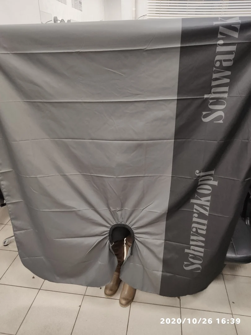Большой по размеру, то что надо для мужских стрижек. Запах после стирки пропал.