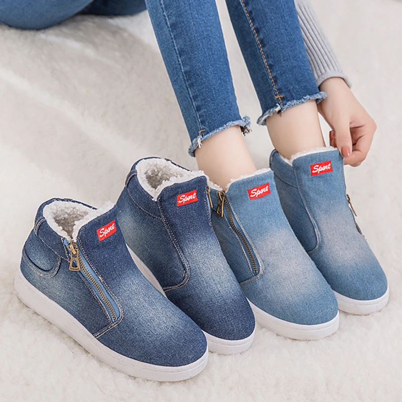 Зимняя обувь; Женские зимние ботинки из джинсовой ткани; Теплая Флисовая Классическая Повседневная обувь на плоской подошве с высоким берцем и круглым носком; Кроссовки; zapatos de mujer