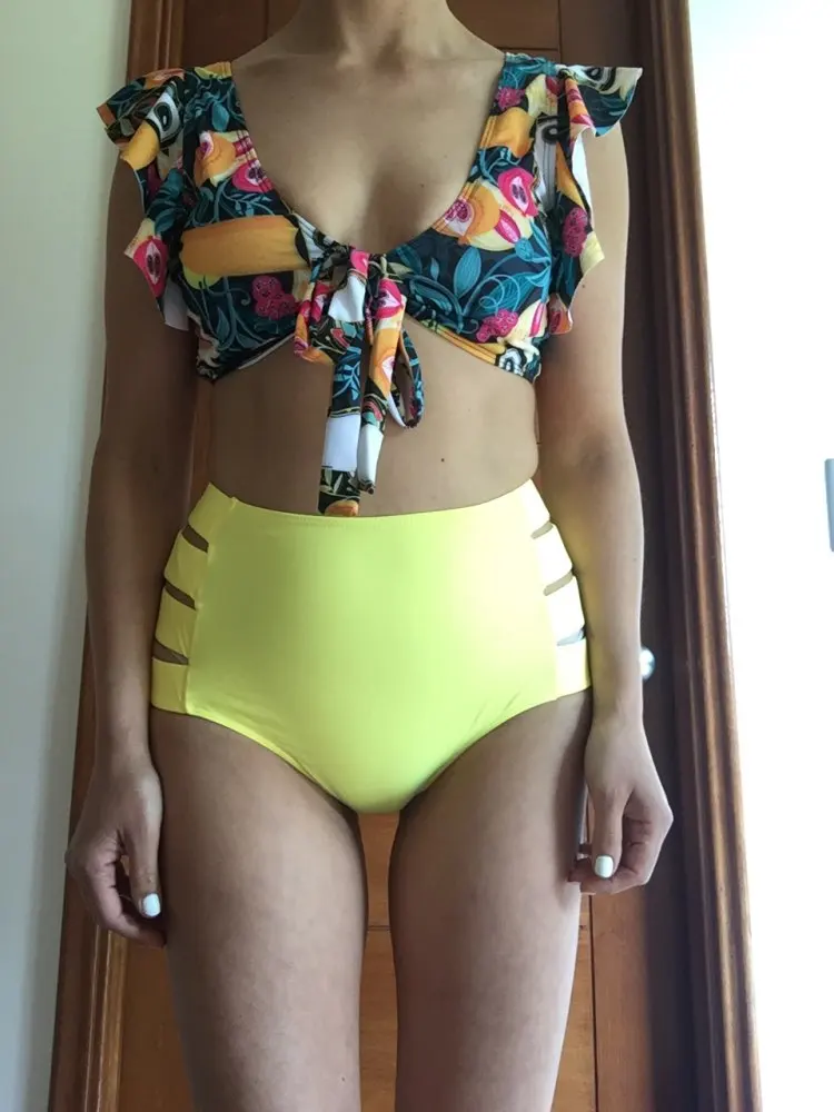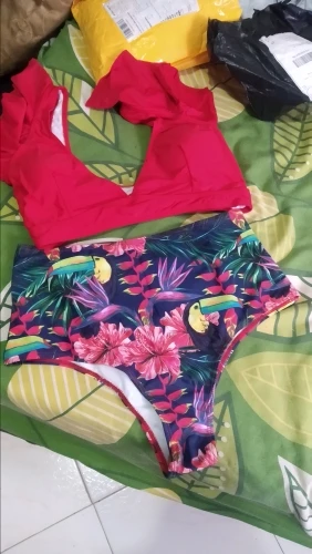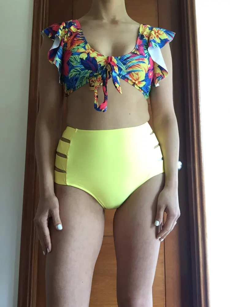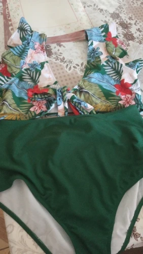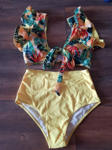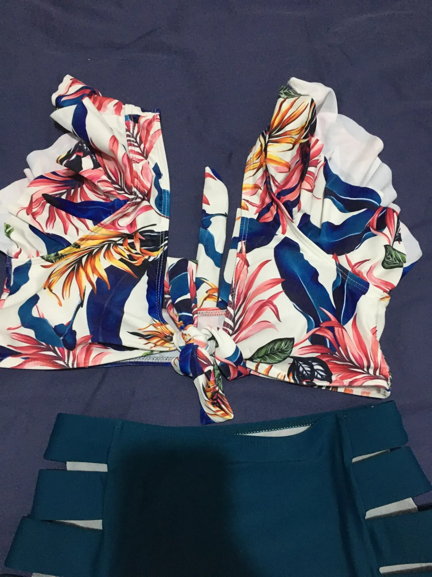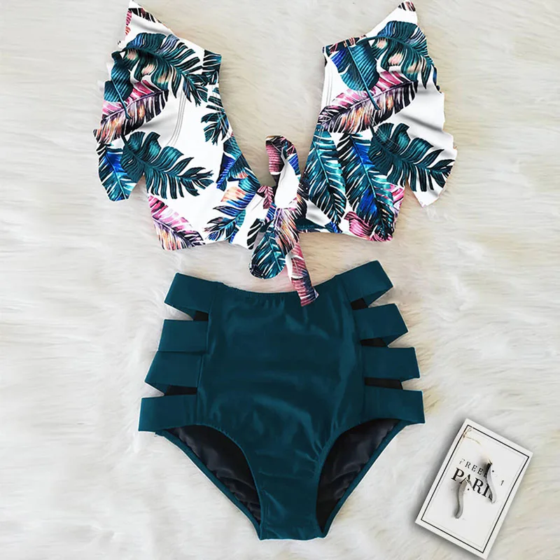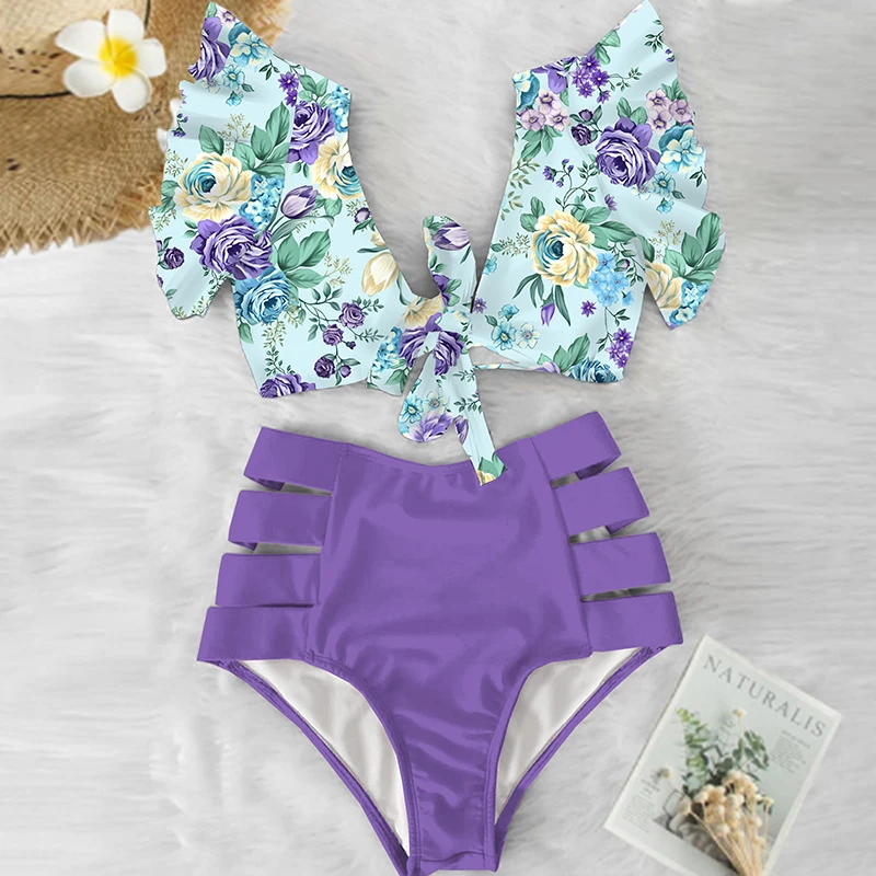 Женский раздельный купальник с цветочным принтом, бикини с оборками на Подоле и высокой талией с V-образным вырезом, пляжный купальный костюм для девушек, 2022