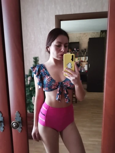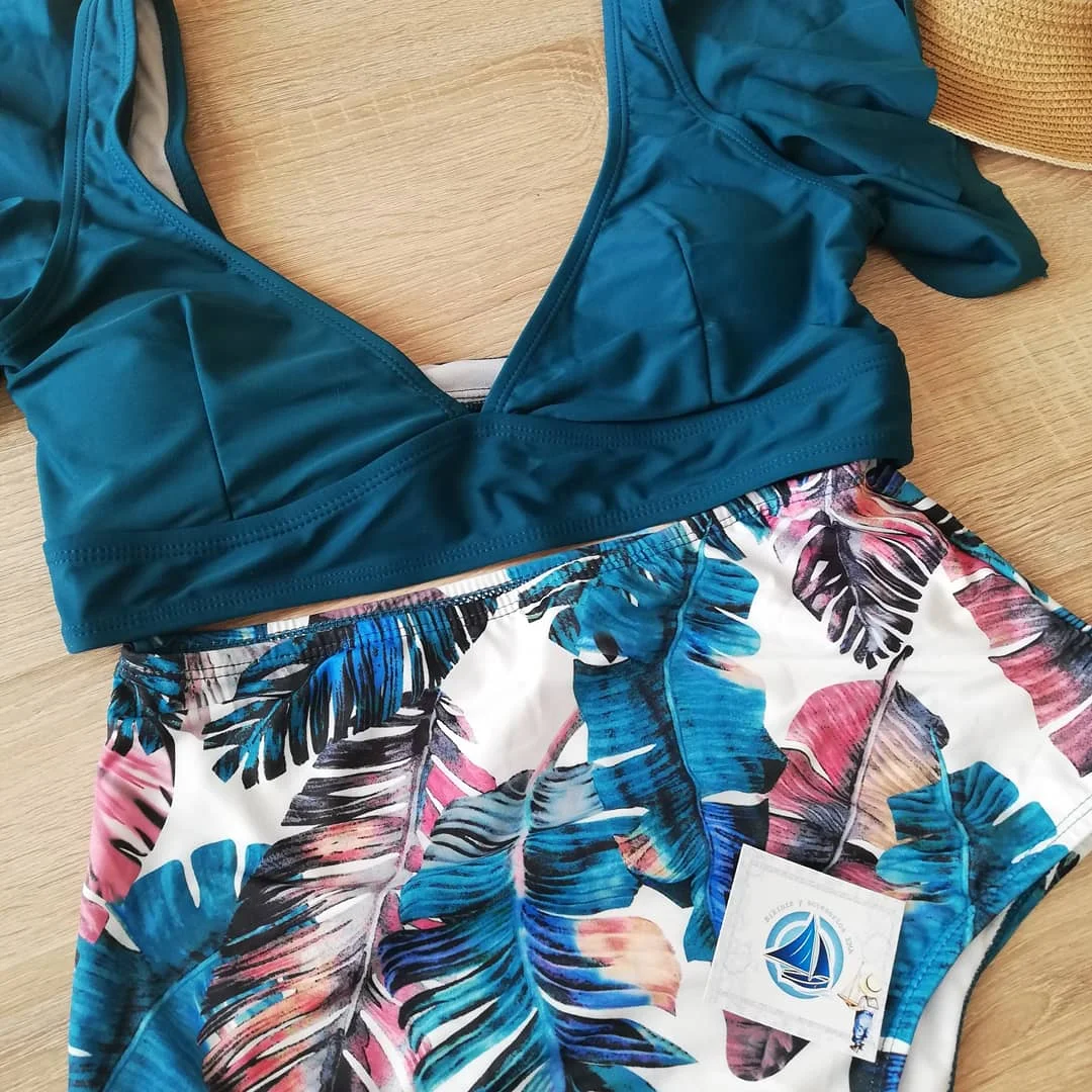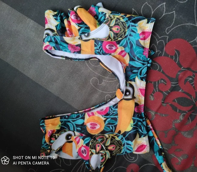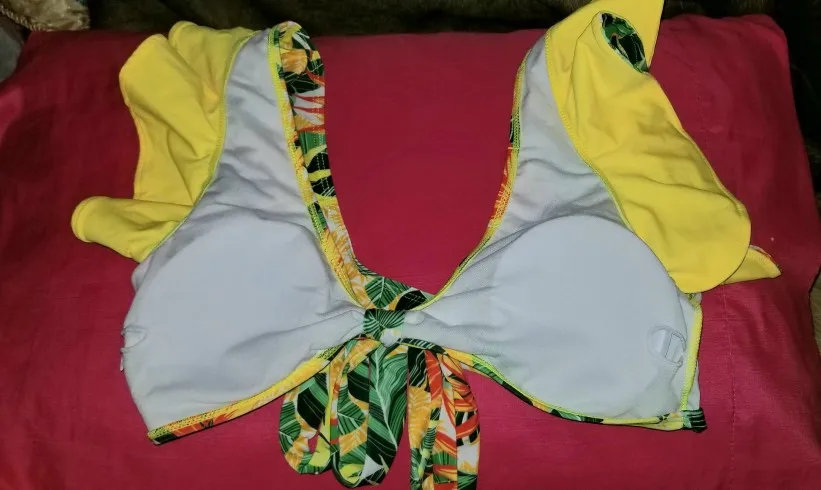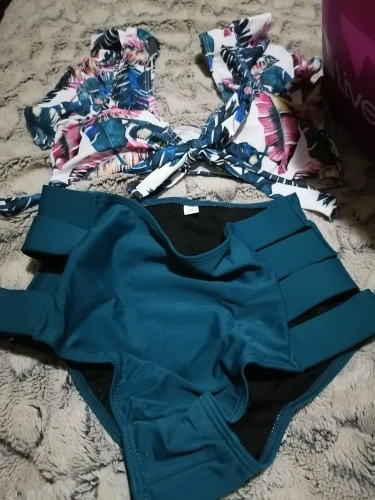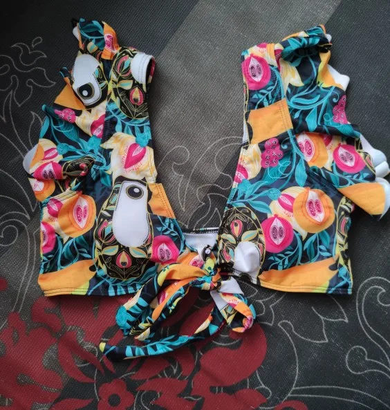 Красивый купальник насыщенного фиолетового цвета. Плавки завышены и имеют разрезы по бокам, где игриво видны бёдра. Лиф бандо, с цветочным принтом. Внутри которого есть съёмные вкладки. Бретели красиво обрамлены волонами. Декольте достаточно глубокое. Лента на лифе тоже съёмная и её можно повязать на руку или закинуть наверх, повязав на шее. Размер S чётко подошёл на ОГ90 и ОБ90