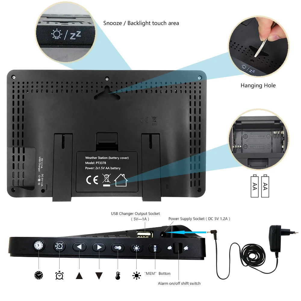Метеостанция Protmex поставляется со встроенным usb-портом для зарядки.Он может использоваться в качестве внешнего аккумулятора для зарядки мобильных телефонов или других устройств при питании от настенного адаптера.2 способа расширения возможностей: адаптер питания переменного тока (входит в комплект) является основной ролью. 2 батарейки типа АА LR6 (не входят в комплект), чтобы убедиться, что они могут выдержать любой король отключения питания.