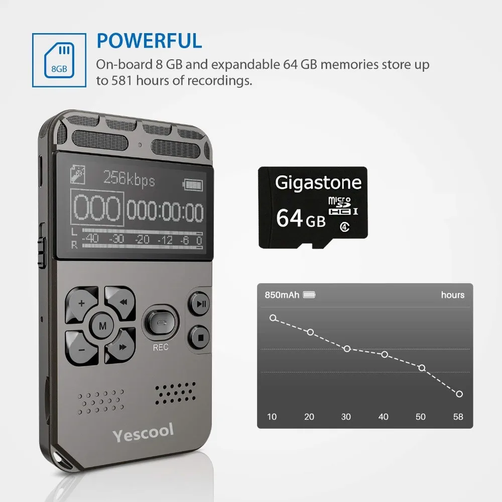 Это профессиональный цифровой диктофон и MP3-плеер с высококачественной стереозаписью, встроенный аккумулятор емкостью 810 мА · ч, длящийся 22 часа, очень долгое время записи, специально разработан для использования в деловой/школьной записи и личных диктантов. Это встроенный в память 8 ГБ диктофон с дополнительной расширенной памятью 64 ГБ, чтобы обеспечить достаточно памяти, идеально подходит для записи телефонных разговоров, лекций, конференций, встреч, интервью, голосовые заметки/напоминания/ежедневные заметки или просто о том, что вы хотите записывать! Просто интерфейс управления для каждого пользователя, даже вы новичок! Компактный размер и легкий дизайн легко носить с собой.