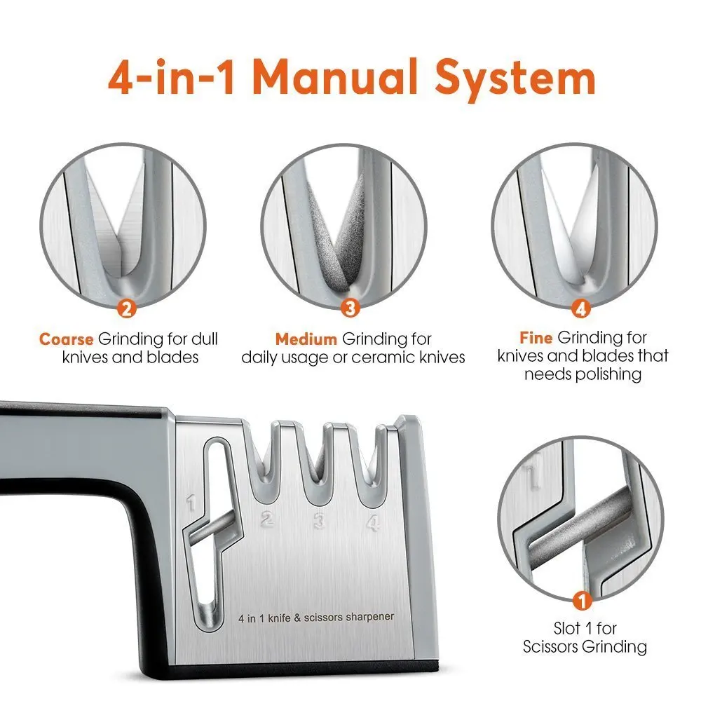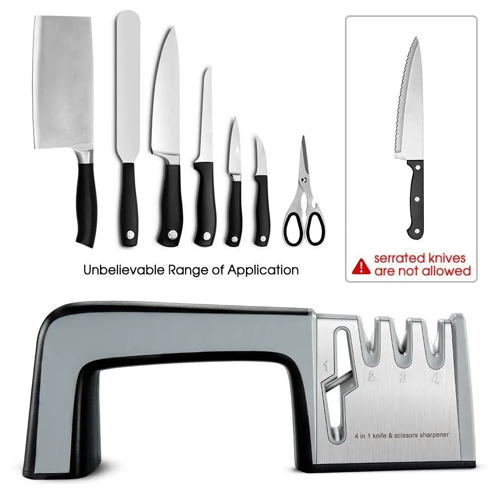 Нож и заточка для ножниц, точилка для кухонных ножей, ручная система 4-в-1, 3-ступенчатый инструмент для заточки ножей с нескользящей основой и эргономичным дизайном