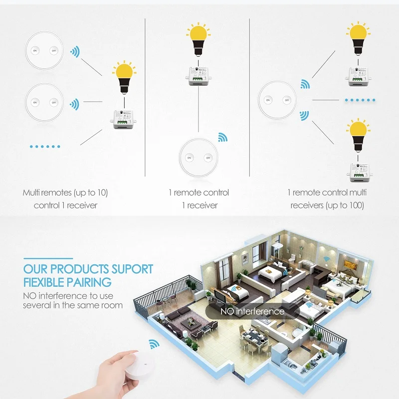 Функция памяти и уникальный идентификатор: релейный приемник запомнит последнюю команду с пульта ДУ до сбоя питания. Если переключатель был включен, он возвращается к включенному; Если он был выключен, он возвращается. Каждый предмет имеет свой уникальный идентификатор, вы можете использовать различные комплекты в комнате без сигнальных помех, идеально подходит для спальни, гостиной, столовой, кухни, подвала, гаража, коридора, лестницы, чердак освещение