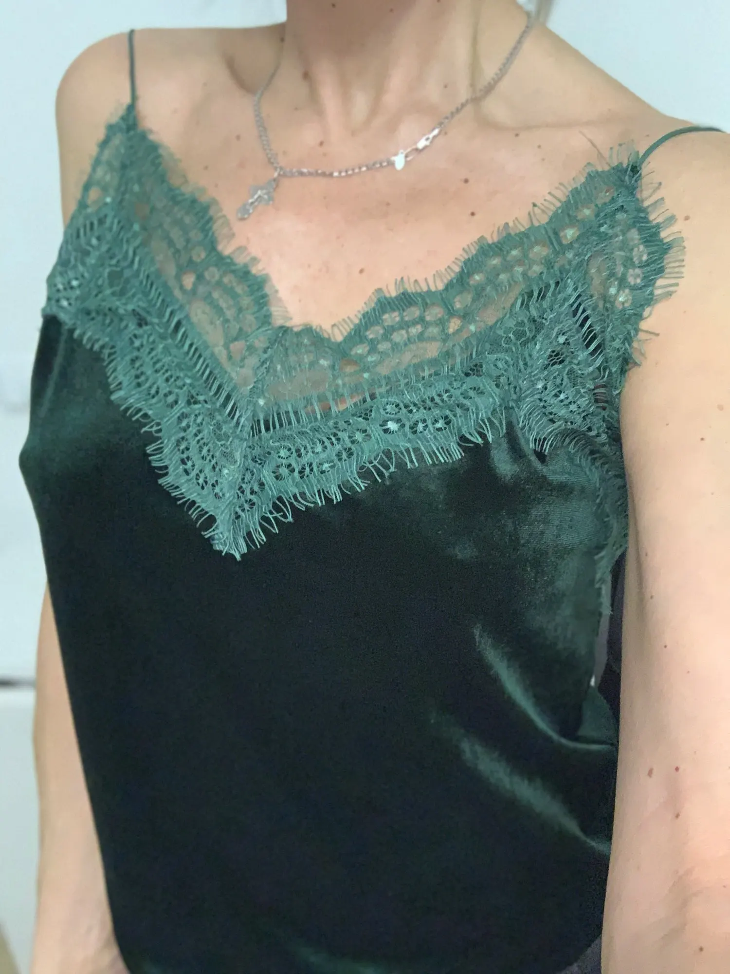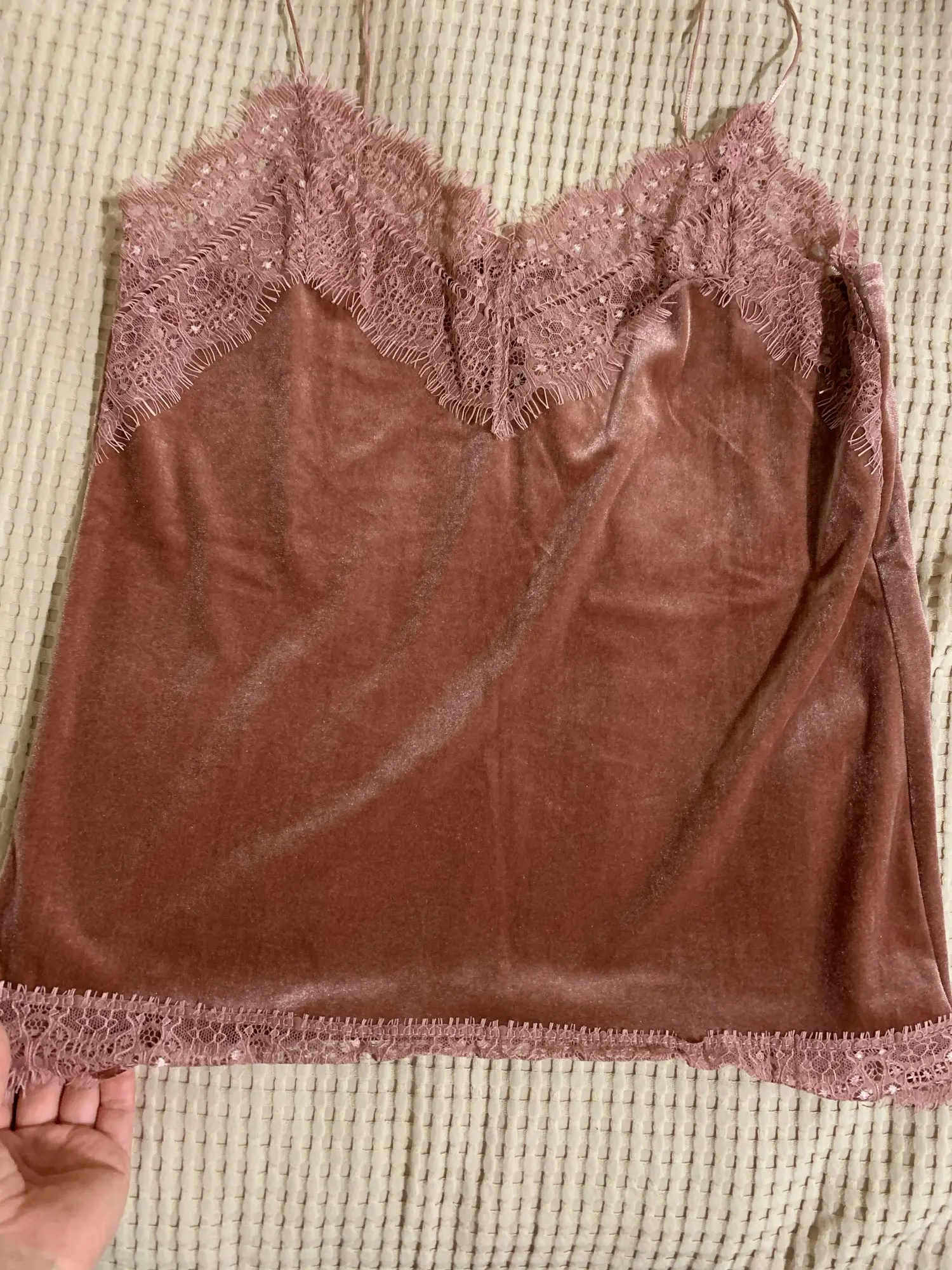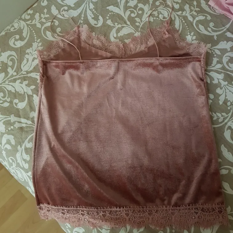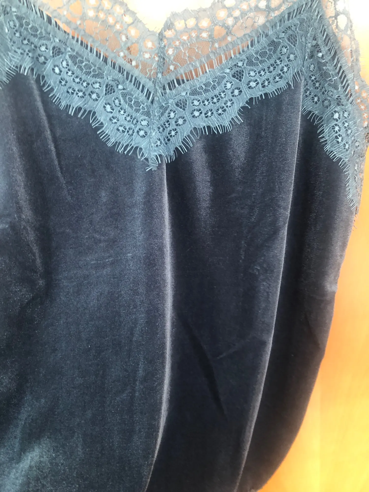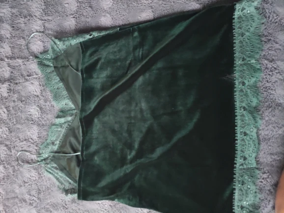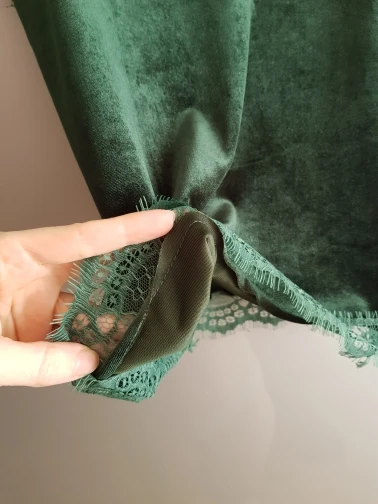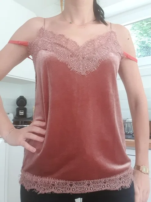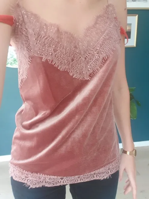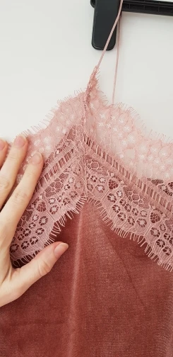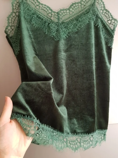 топ среднего качества. бархат не обработан, кружево просто настрочено сверху. Сам бархат - стрейч, кружево - нет. по низу мне узковато, придется отпароть кружево и обработать низ топа. цвет красивый. Лямки для меня коротковаты. я сразу после покупки писала продавцу с просьбой о замене цвета, продавец не ответил ни на одно сообщение. Отсутствием коммуникации я не довольна.