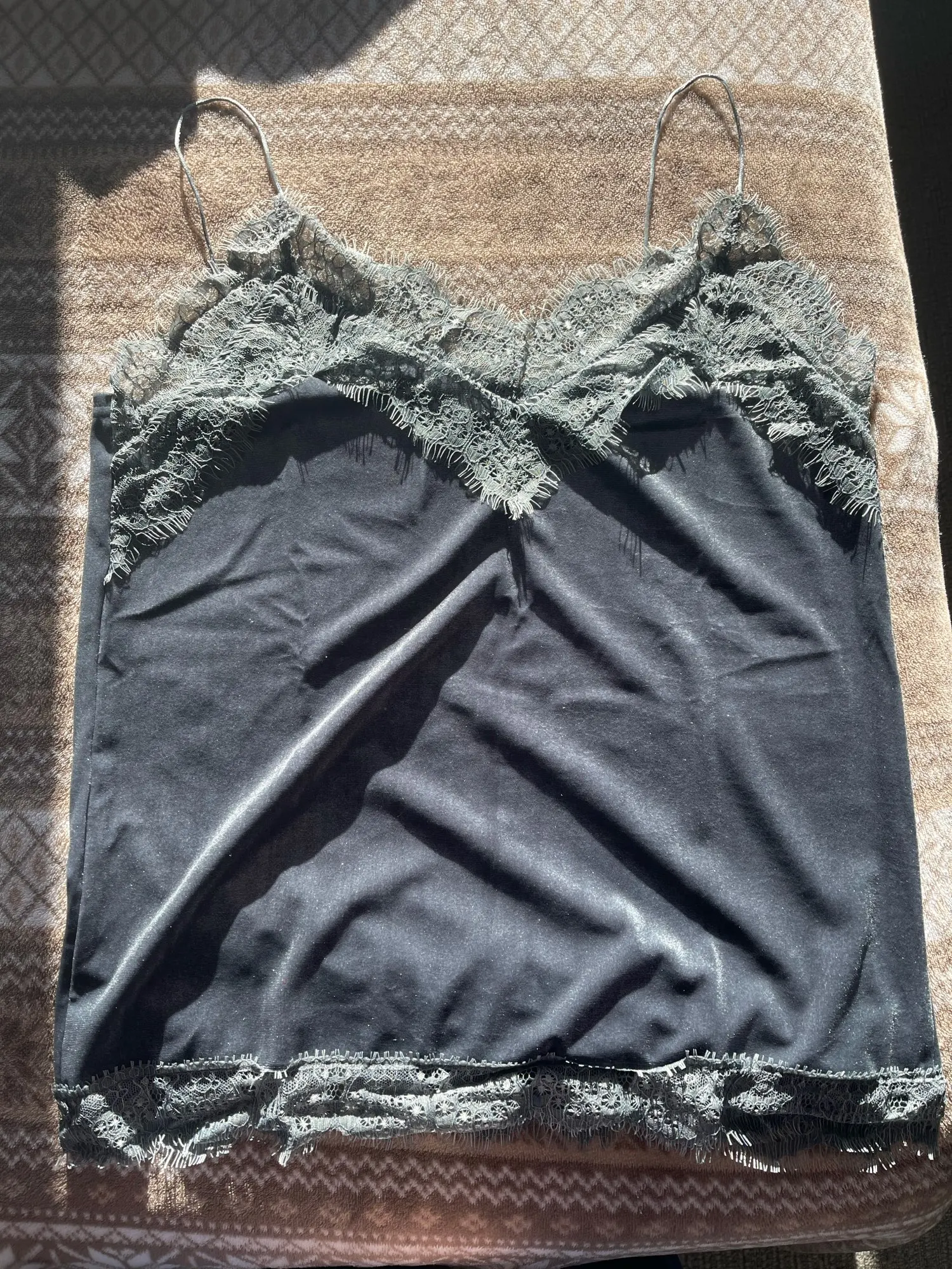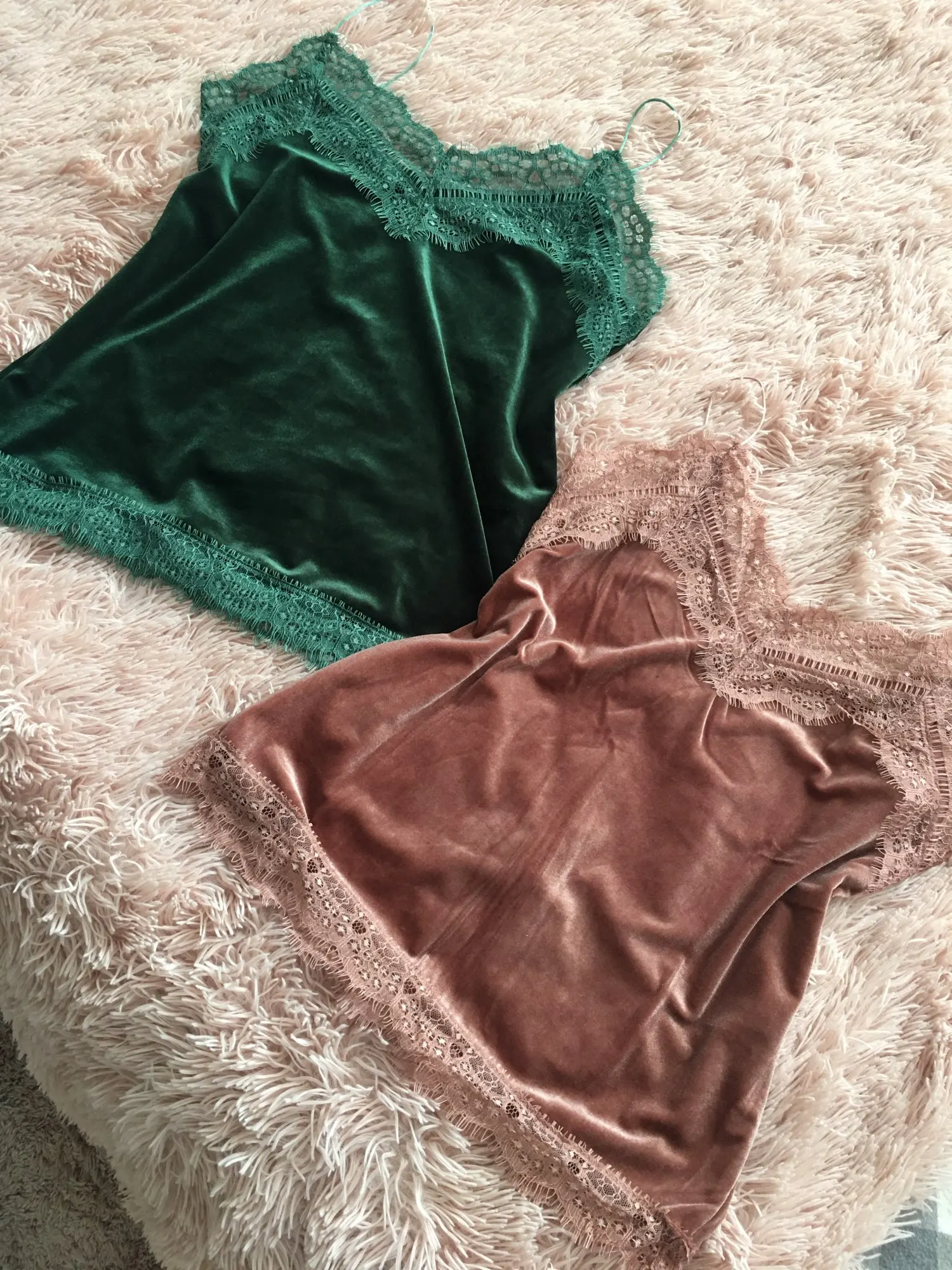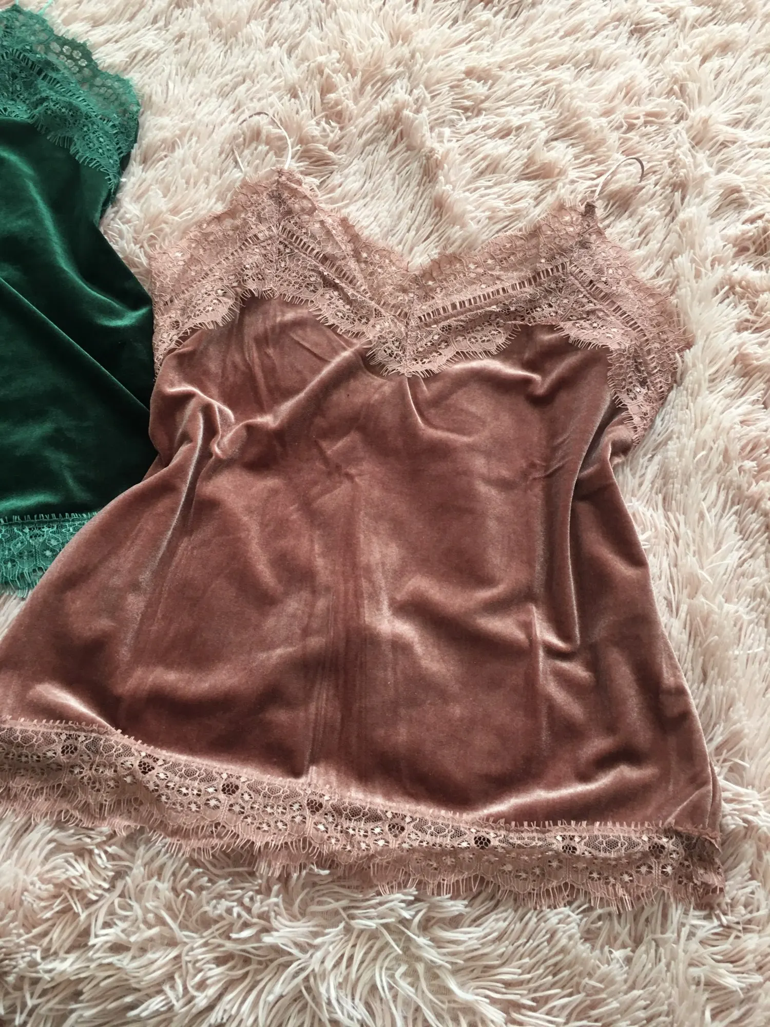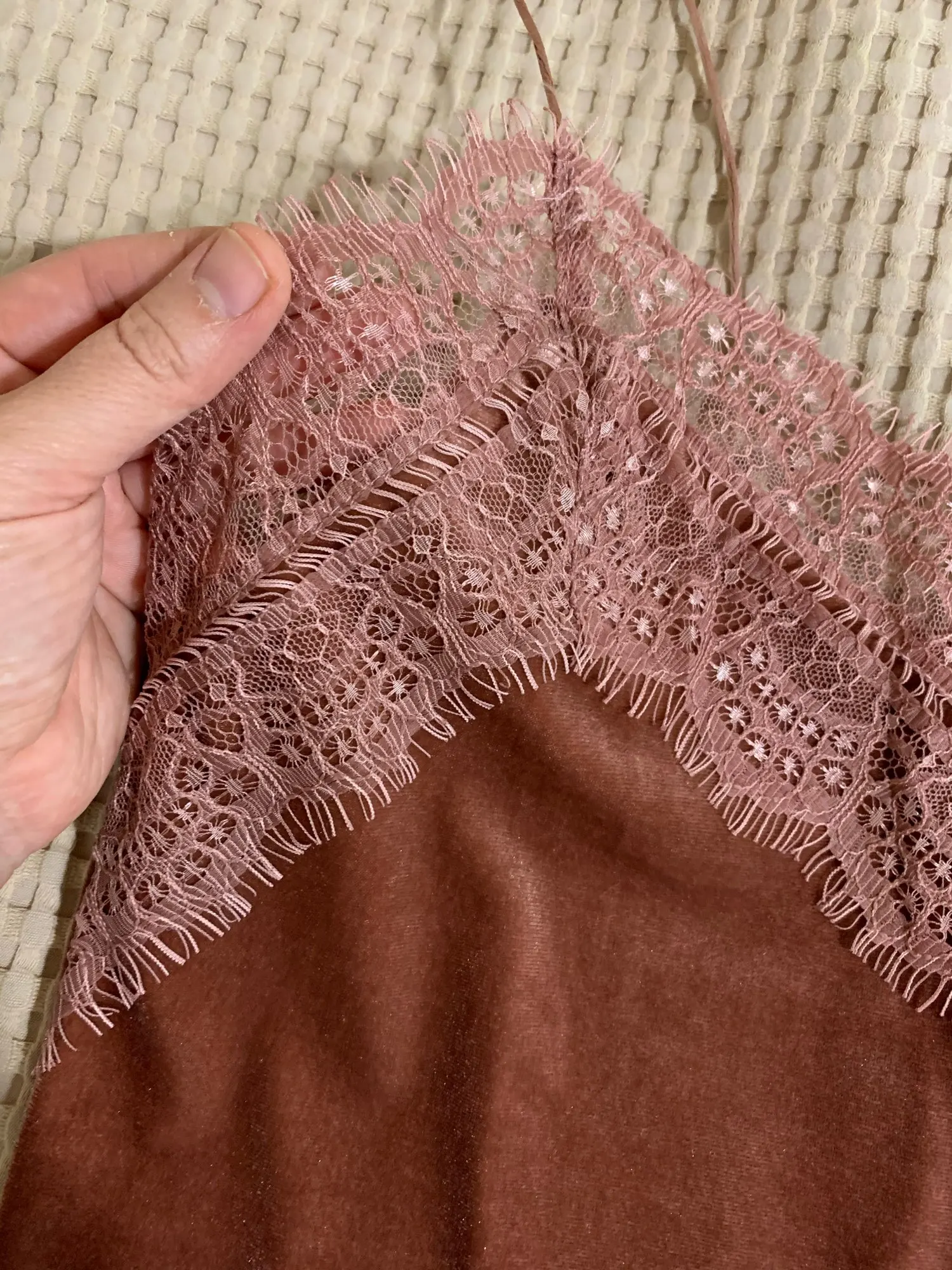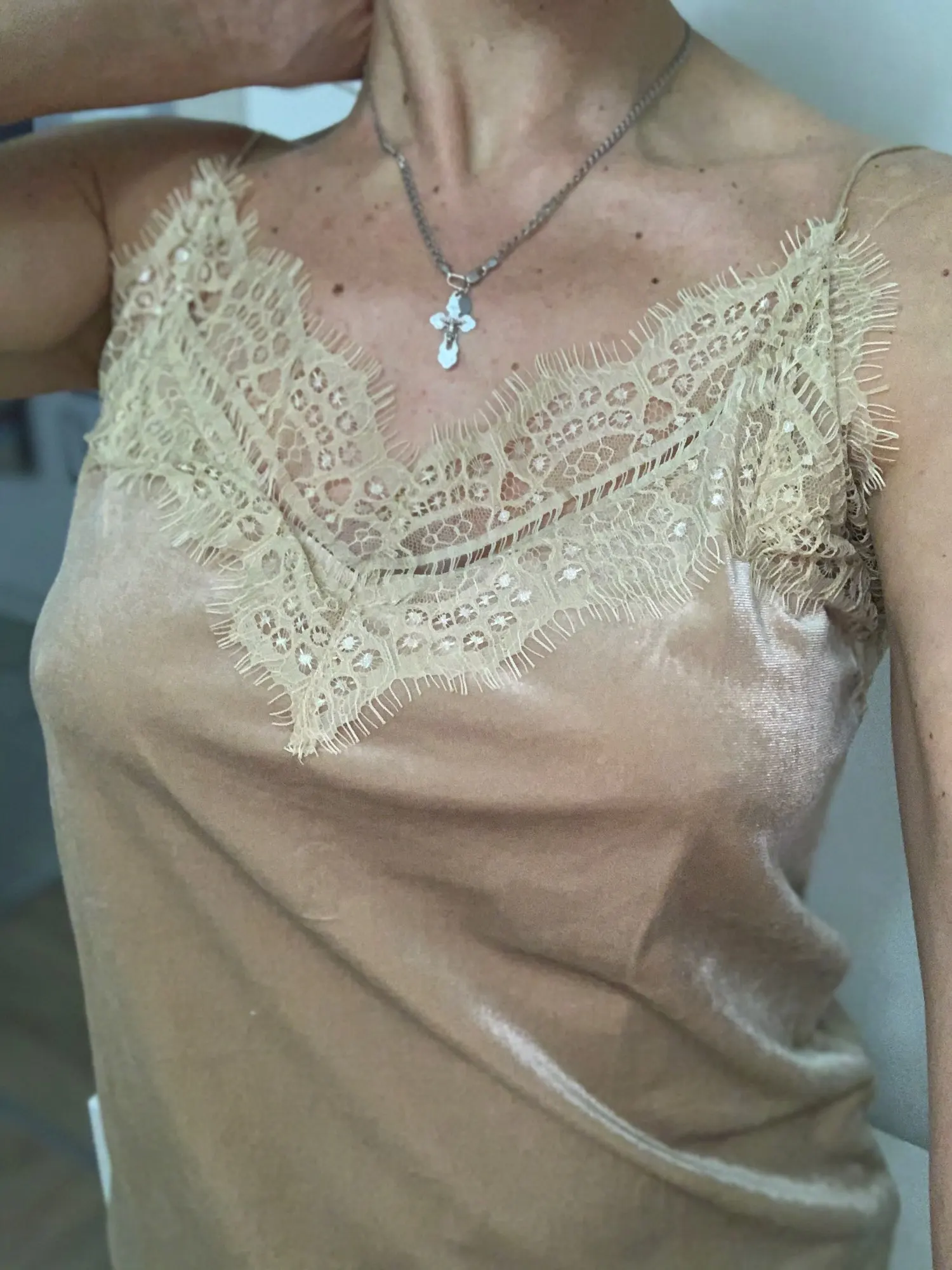 топ среднего качества. бархат не обработан, кружево просто настрочено сверху. Сам бархат - стрейч, кружево - нет. по низу мне узковато, придется отпароть кружево и обработать низ топа. цвет красивый. Лямки для меня коротковаты. я сразу после покупки писала продавцу с просьбой о замене цвета, продавец не ответил ни на одно сообщение. Отсутствием коммуникации я не довольна.