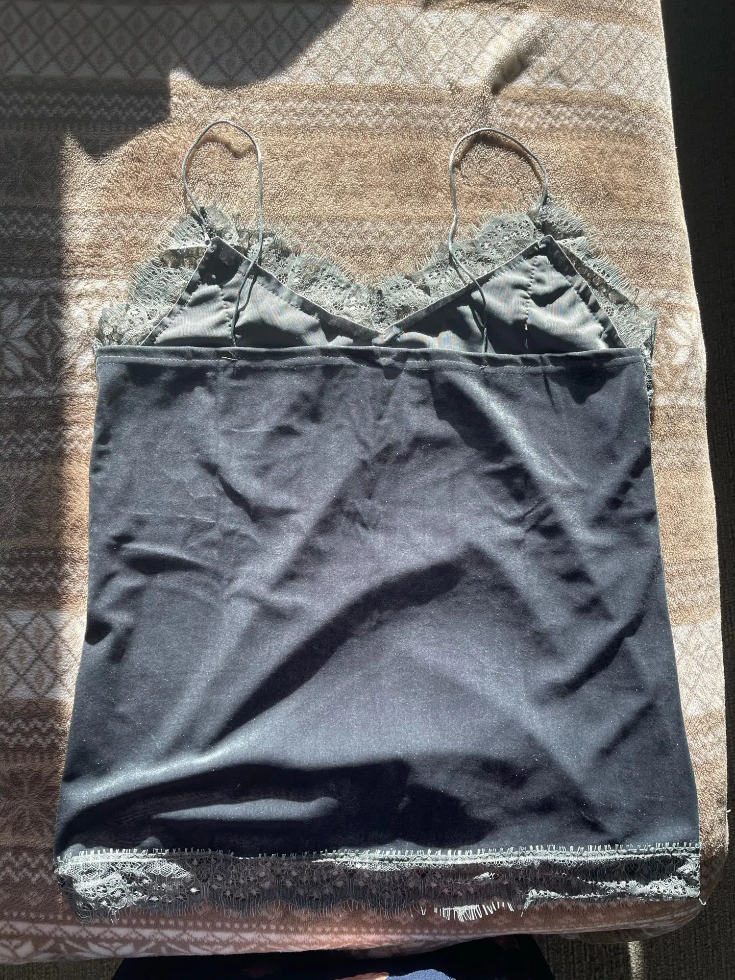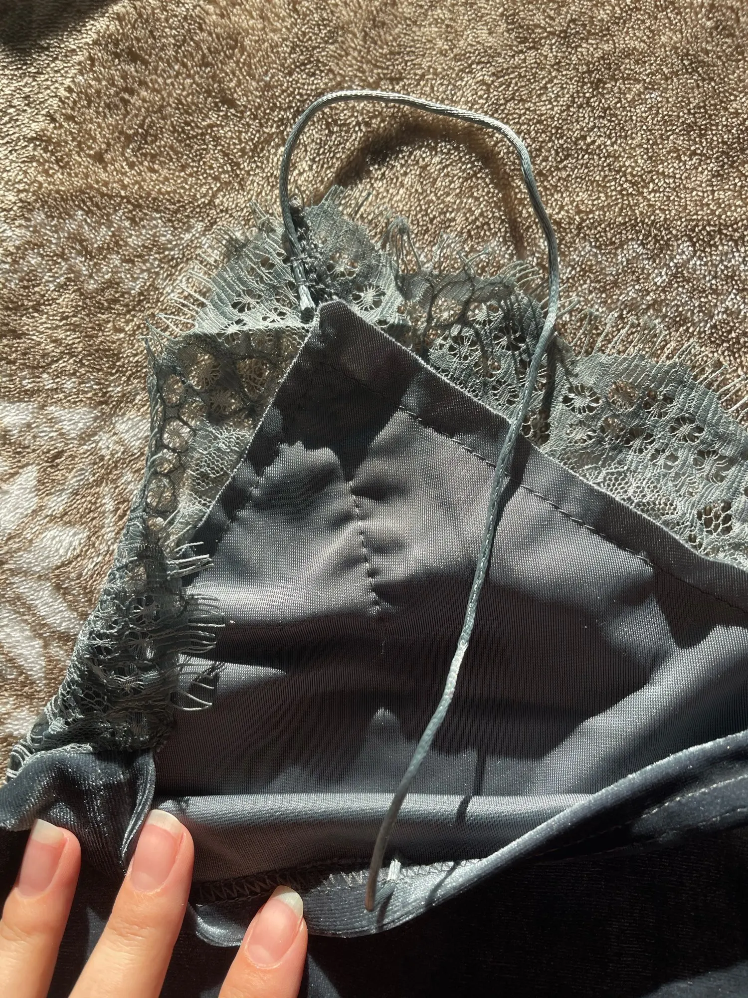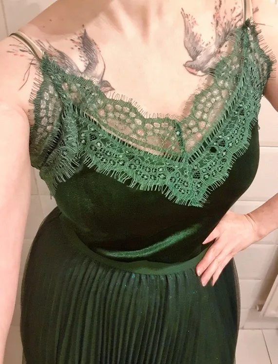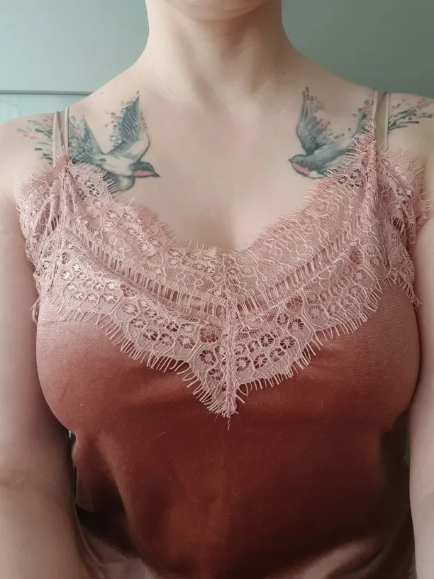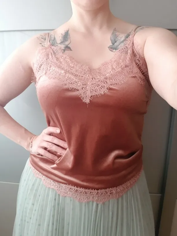Изделие соответствует описанию, хотя кружево слишком широкое и слишком сильно прилипает к краю горловины и подмышкам. Я заказал серо-синий, и я доволен цветом-это хороший классный оттенок и выглядит очень достойно и элегантно. Материал в порядке. Спасибо продавцу!