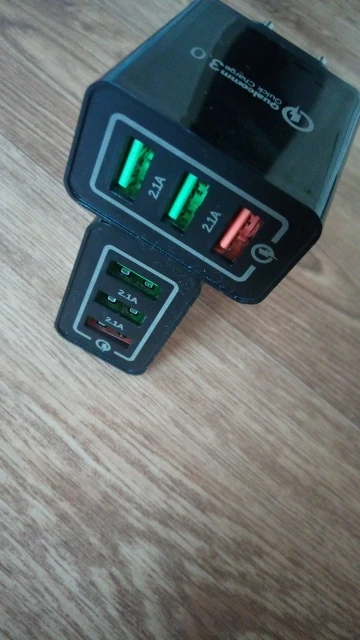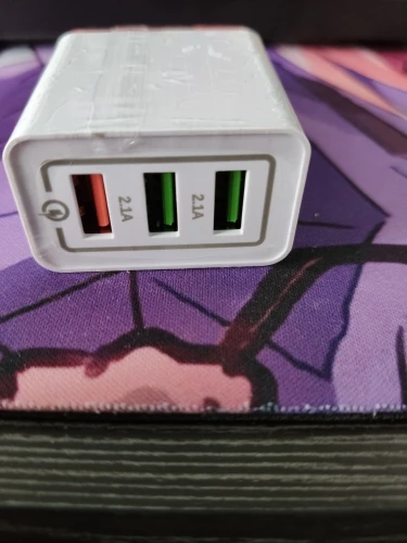 без нагрузки два выхода, где 2.1 А показывает 4.96 вольта . выход быстрой зарядки без нагрузки 5.2 вольта. что уже говорить о качестве заряда телефона. под нагрузкой напряжение проседает до 4.82 вольта. Ток максимум по всем трех выходах максимум 1.2 А. плюс свистит плата внутри корпуса подключенная к сети зарядка. покупал за 0.01 цент, больше она и не стоит. быстрой зарядки нет. цвета зарядных устройств на фото более насыщеней, в реале мутный, несоответствуют фото. короче, кому, как повезет, что отправит продавец. я не советую.