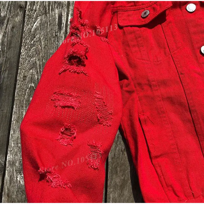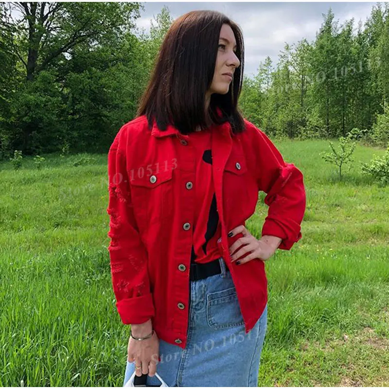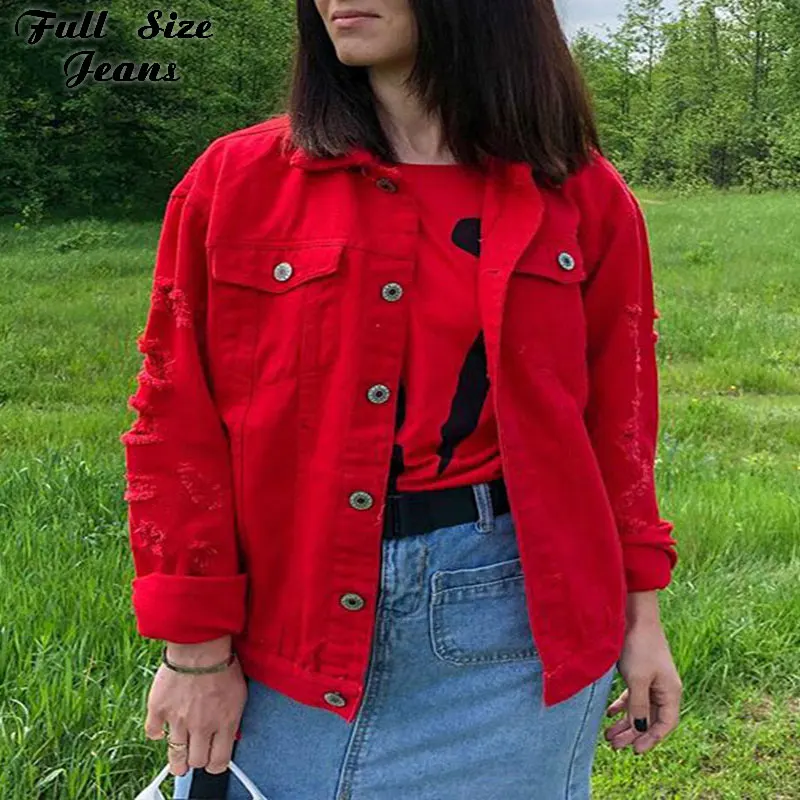 Женская джинсовая куртка, свободная повседневная куртка из черного рваного денима, розового и красного цветов, 4XL, 5XL, для весны, размера плюс