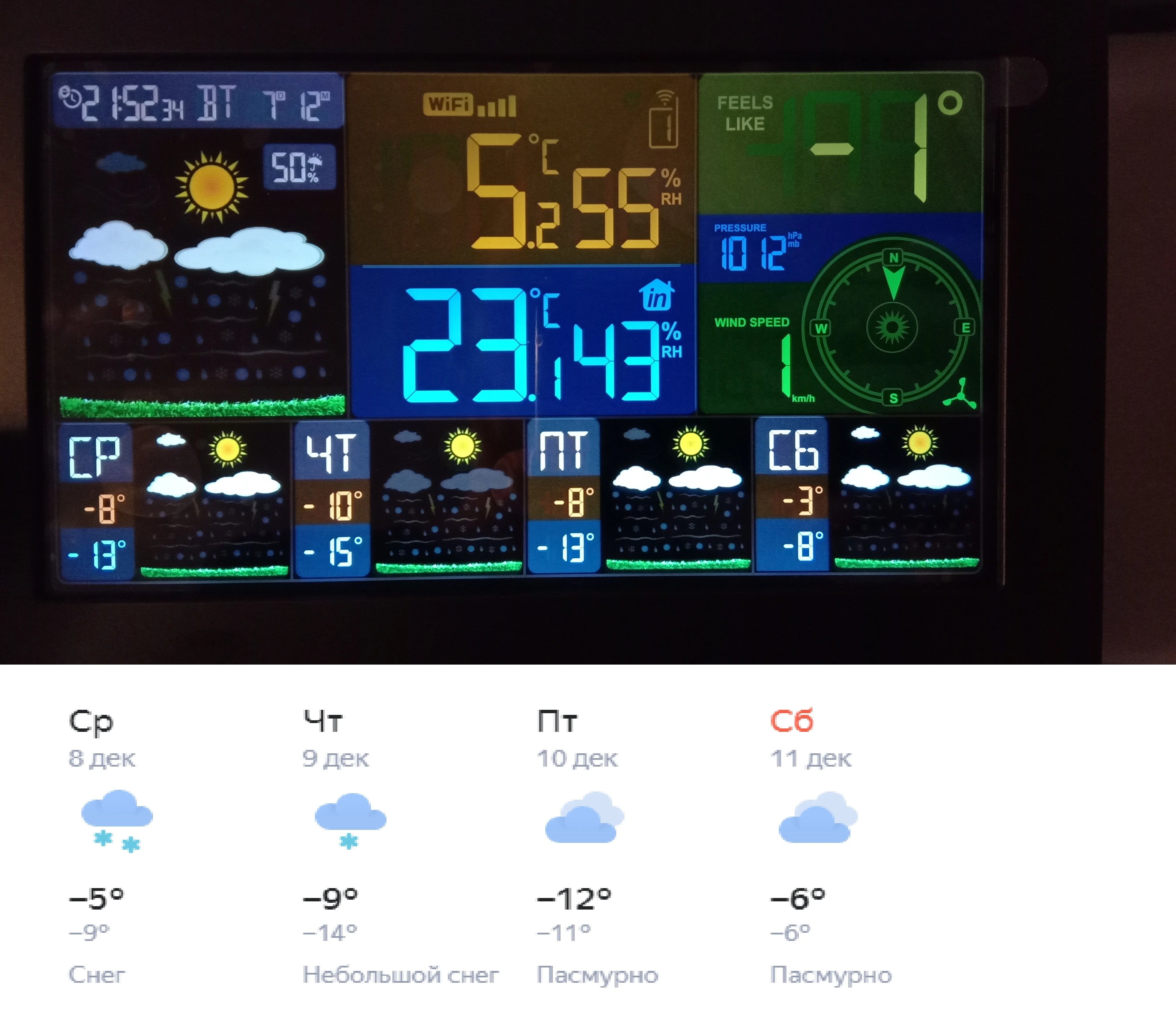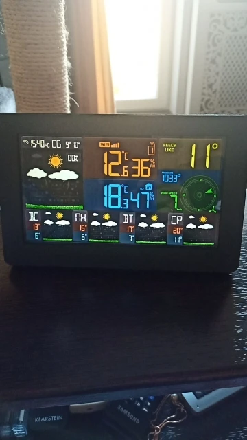 Станция в принципе неплохая, но есть два существенных недостатка 1. Дисплей - не очень хорошая цветопередача, засветы, нормально показывает только под определенным углом 2. Прогноз погоды - непонятно откуда они его берут, не сходится ни погода, ни температура. В остальном всё неплохо. Внешний датчик хороший, показывает правильную температуру.