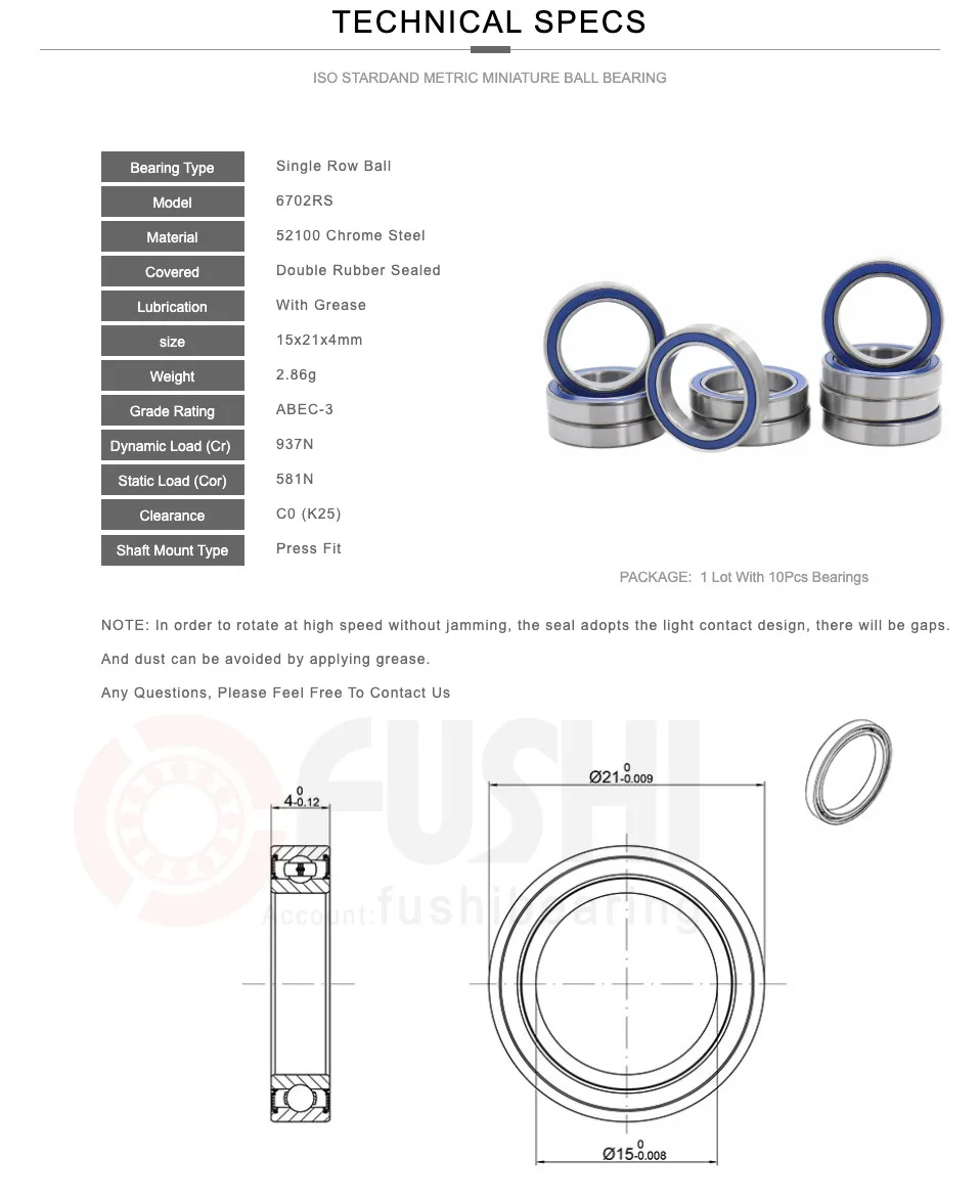 Подшипник 6702RS, 10 шт., 15x21x4 мм, ABEC-3, Электрический Радиоуправляемый автомобиль, грузовик 6702 RS 2RS, шарикоподшипники 6702-2RS, синие герметичные