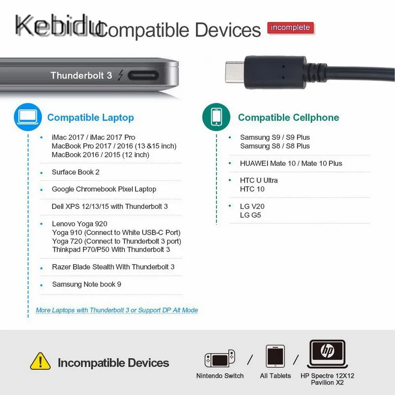 Cypress и парадные чипсеты, коаксиальные кабели в качестве оригинального материала. Наши продукты оснащены технологией автоматической сварки под низким давлением, чтобы гарантировать его качество. Сторона 1: USB 3,1 Тип C Мужской пластиковый корпус белый. Сторона 2: к VGA женщинам используется полная медь, проводящая высокая эффективность, меньше тепла, высокая прочность, более стабильная передача сигнала, луженая медная оплетка, Защитная сеть с двойным экраном, сильная защита от помех (EMI). USB 3,1 Type-C для VGA / HDMI совместим со следующими устройствами: Новый MacBook 2016 Новый Chromebook Pixel Dell XPS 13 Yoga 900(Yoga 4 Pro) Asus Zen AIO все в одном ПК Lumia 950 / 950XL (разрешение дисплея поддерживает максимум: 720p)