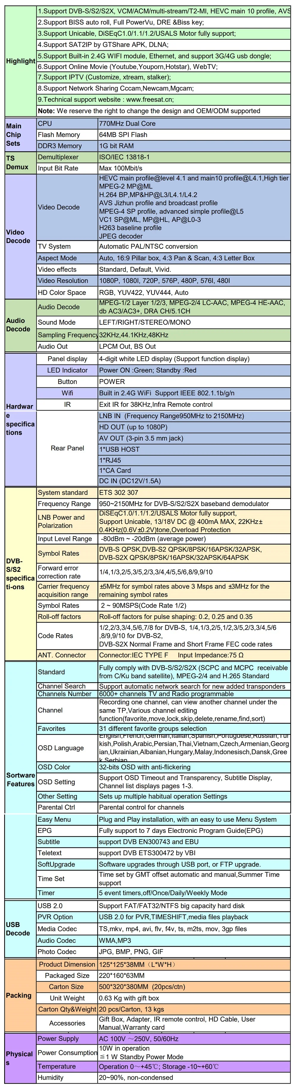 3, поддержка Unicable, DiSEqC1.0/1,1/1,2/USALS мотор полностью поддерживает;