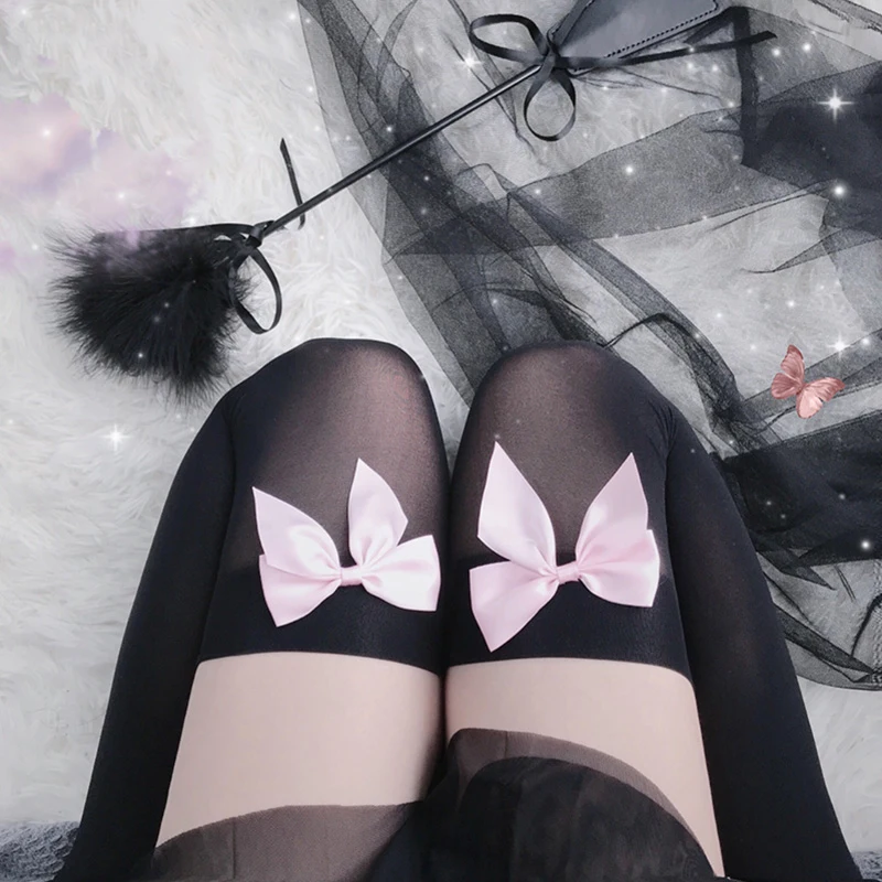 Чулки ручной работы Lolita с розовым бантом, женские сексуальные чулки, бархатные чулки до бедра, прозрачные чулки с бантом, сексуальные чулки выше колена