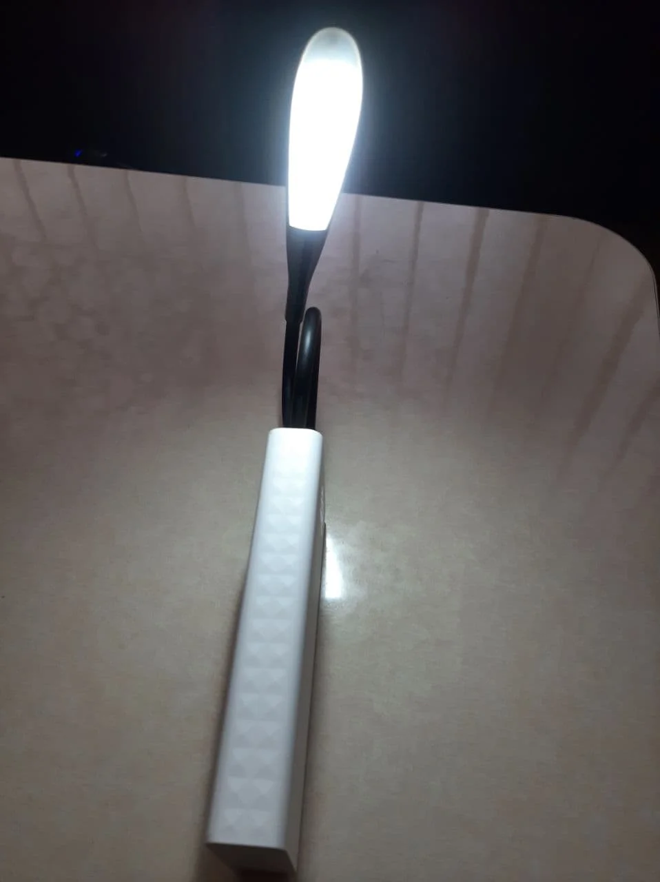 Классная вещь. Три уровня яркости - от совсем тусклого, который точно ночью никого не разбудит и не помешает, до довольно яркого. Очень хорошо гнется и держит форму. Единственный нюанс - вес для гнезда usb все-таки чувствуется.