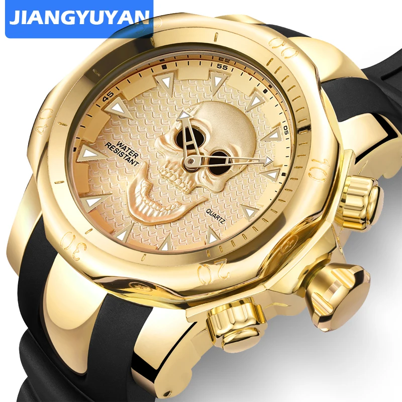 Дизайн-с подарочной коробкой, большим циферблатом; Ремешок для часов из силиконовой резины; Золотой корпус. Уникальный дизайн 3D черепа делает вас более зрелым, надежным и мощным.