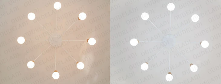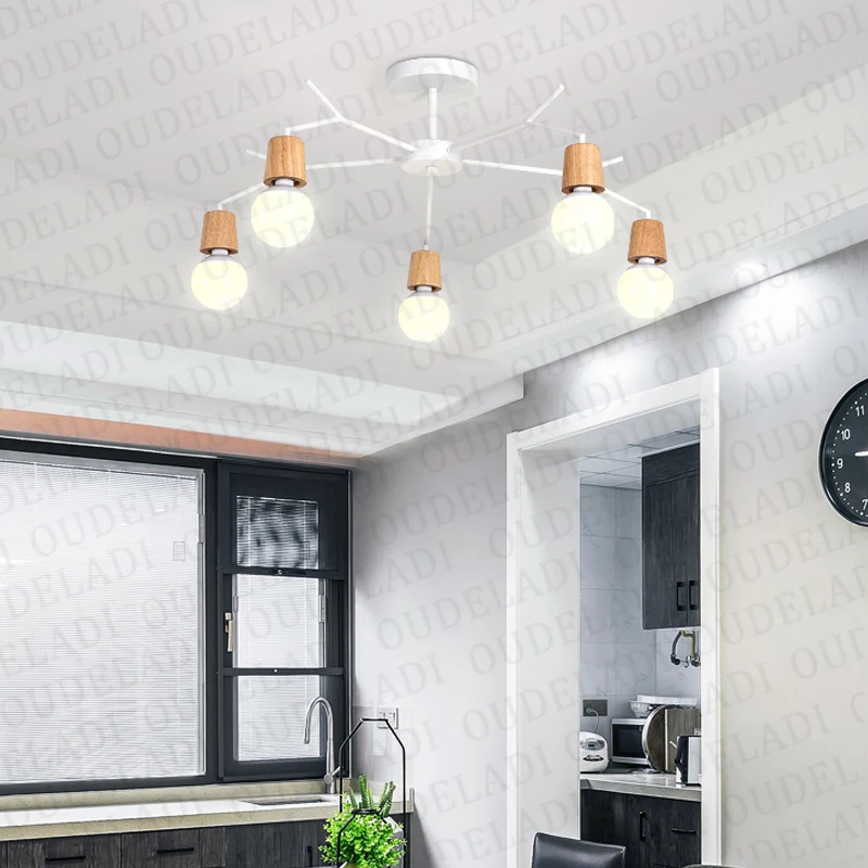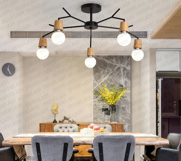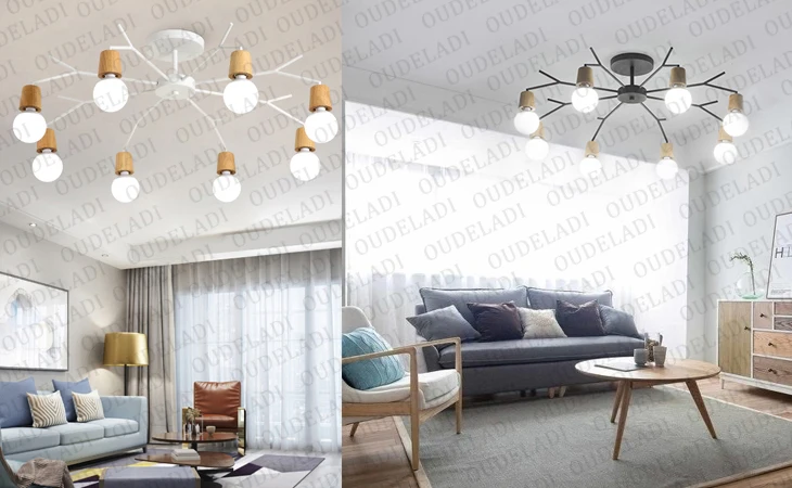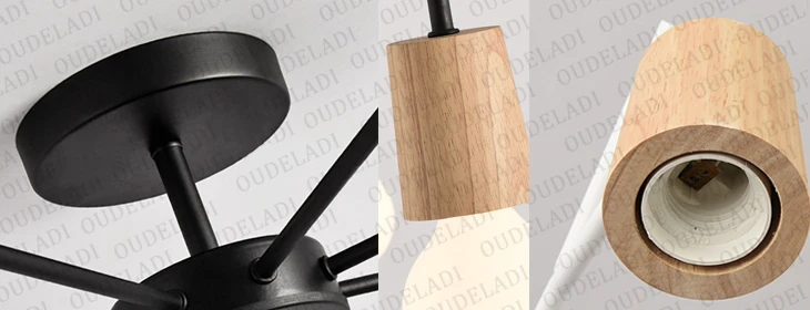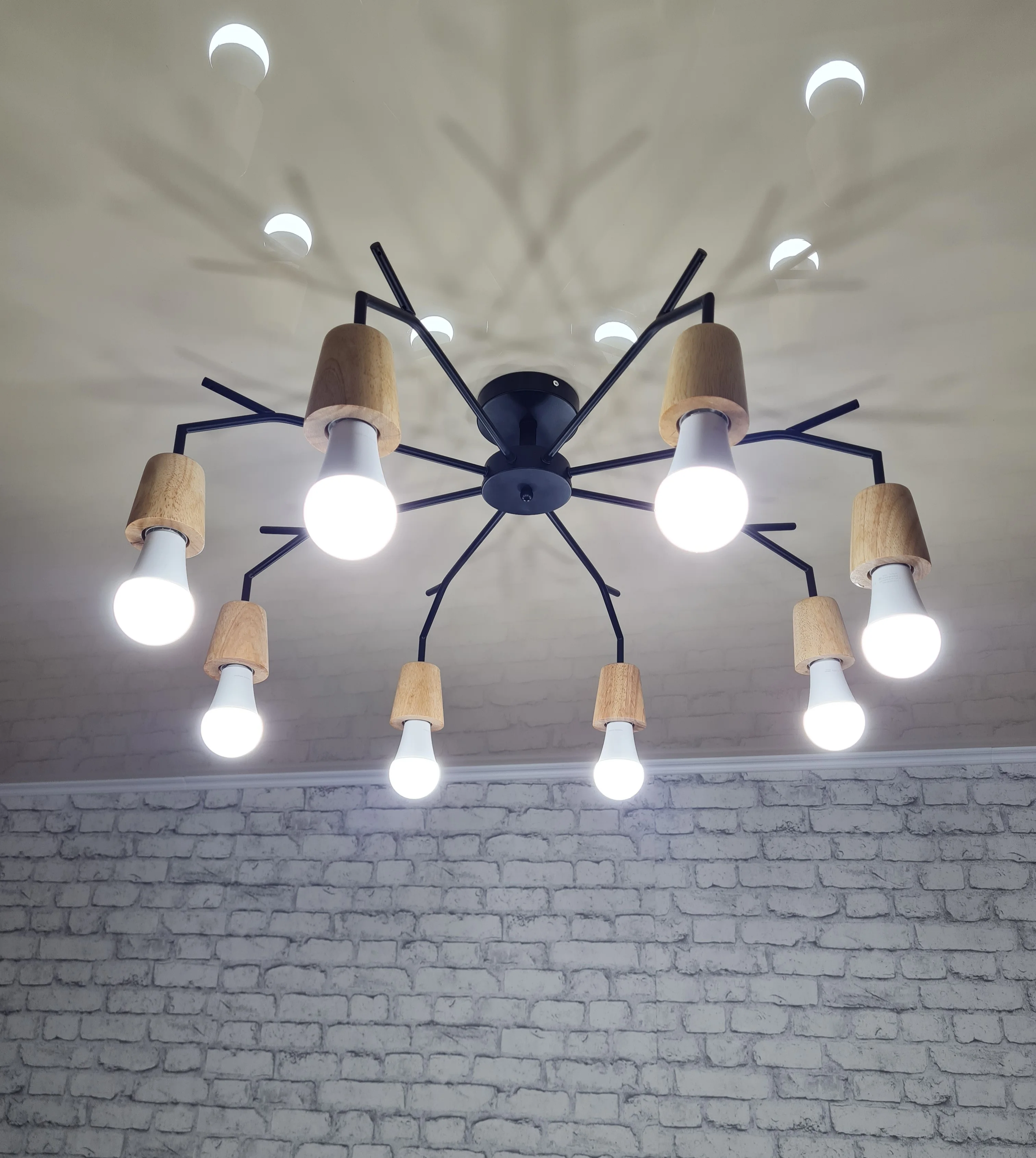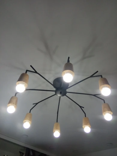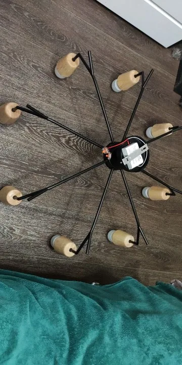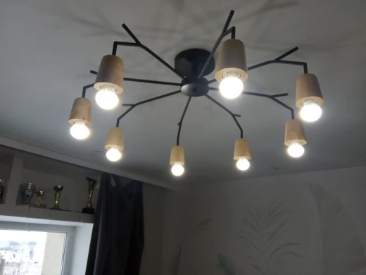 Классная люстра ! Собирается легко , деревянные плафоны правда оказались немного разных тонов дерева , но в глаза не бросается . Жаль , что нет крепления на крюк.