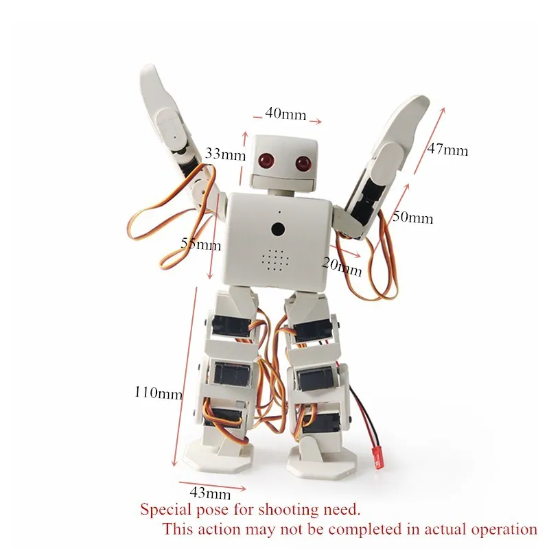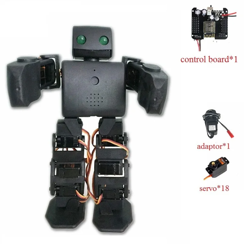 18 гуманоид DOF robot состоит в основном из головы, туловища, двух рук, двух ног. Использование цифровых сервоприводов с большим крутящим моментом для питания робота! (программа управления вращением головки не разработана, но обеспечивает интерфейс). Робот использует высокочувствительные металлические зубчатые сервоприводы 12 г, которые могут быстро реагировать.
