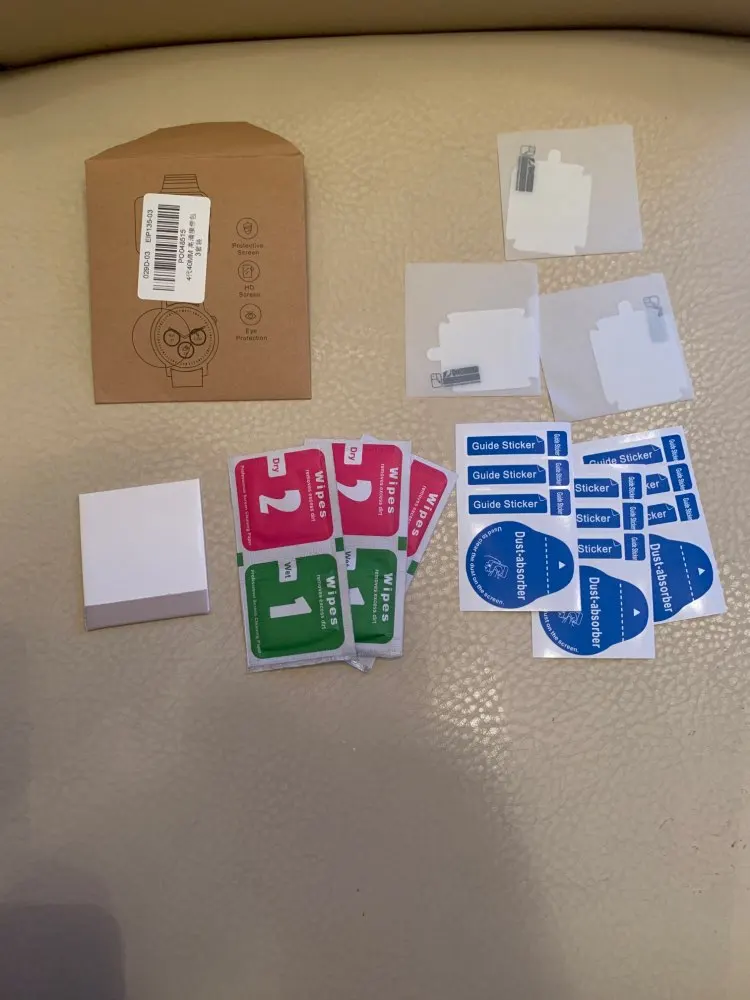 беру пленку в этом магазине на часы уже не первый раз, брал жене и себе, вот решил обновить пленку на часах жены, старая продержалась почти год, а это о многом говорит. правда раньше были в специальной коробочке, сейчас видать решили сэкономить. ГЛАВНОЕ дать часам после наклейки пленки полежать часов 10-12, я обычно клею на ночь, ночью лежат на тумбочке, надо для того, что б ушли пузыри и пленка лучше приклеилась к экрану. полностью пузыри уходят на вторые сутки.
