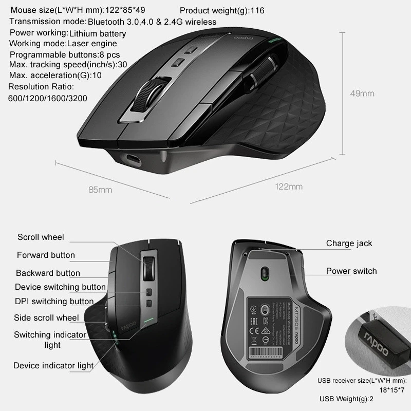 Отличный продукт. Отлично работает. Мыши работают с 4 устройствами одновременно (просто нажмите кнопку) и имеют 4 уровня dpi. Chrage с контактором micro usb