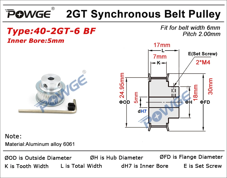 Тип: 16-2GT-6 BF и 20-2GT-6 BF и 40-2GT-6 BFШаг: 2 ммКоличество зубов: 16 зубов/20 зубов/40 зубовНаружный диаметр (OD): 9,68 мм/12,22 мм/24,5 мм