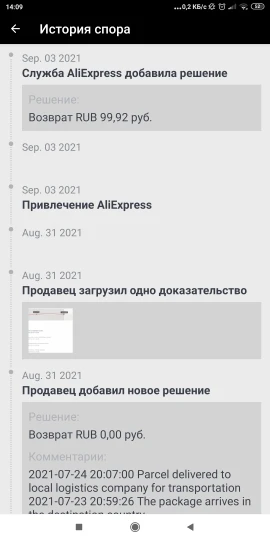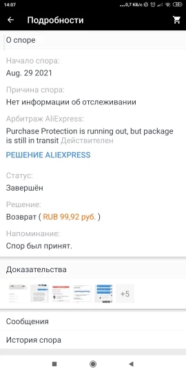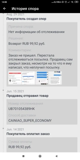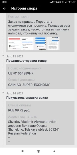 Посылка перестала отслеживаться. Заказ не пришёл, о чём я сообщил продавцу. Я попросил чтобы продавец выслал мне товар повторно либо вернул средства. Продавец перестал отвечать и сам закрыл заказ. Пришлось открыть спор. Продавец отказался возвращать деньги. Спасибо вмешательству Али экспресс деньги вернули на 4 день спора. Не заказывайте у данного продавца! Продавец не надёжный!