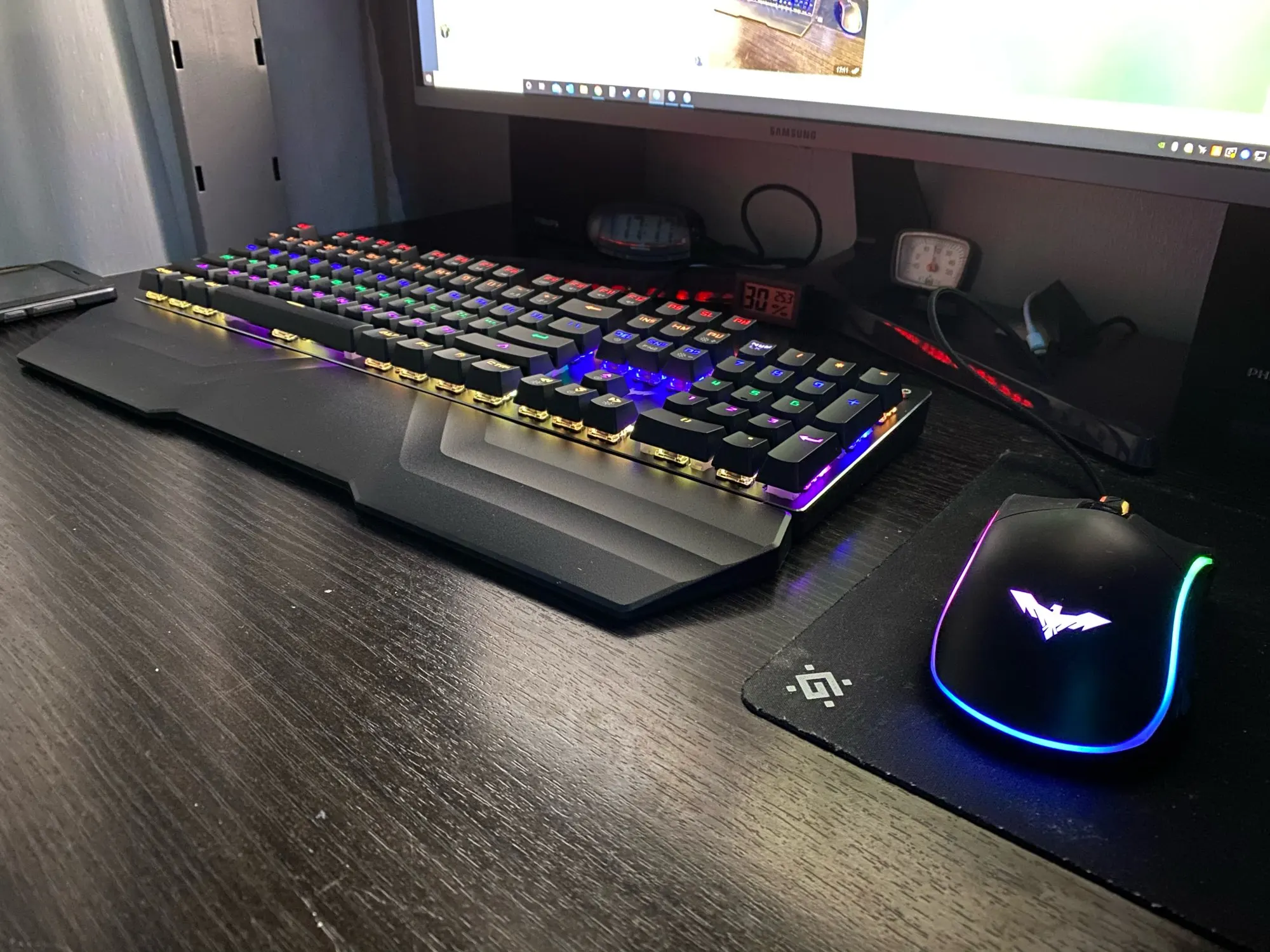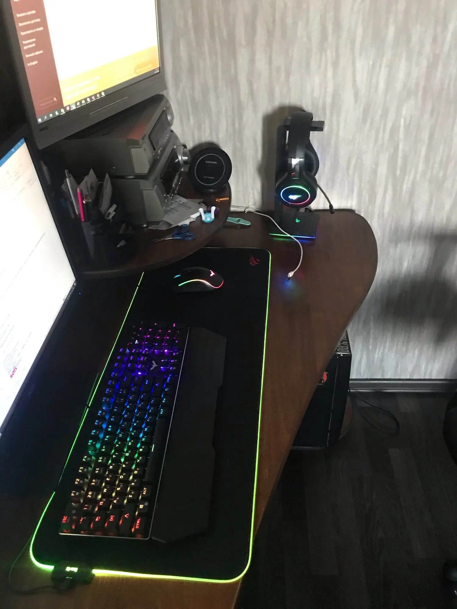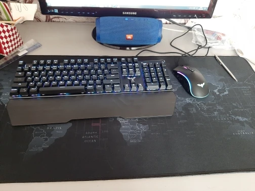 Всем привет. Вообщем выбирал очень долго. Взял набором : коврик, наушники, механическую клавиатуру с мышью. Доставка очень быстрая. Пишу отзыв спустя три недели пользования. Эстетически это выглядит прям супер. По сути за эти деньги товар топ. Продавец все сделал быстро, очень адекватный. Если прям приделаться тогда: мышка легкая(но я уже привык), прорези под большой палец ( при долой работе потеет рука), по наушникам все из пластика, нет железного основания. Про подставку под наушники - тут свой функционал выполняет на все сто, было бы идеально если бы ещё была беспроводная зарядка для телефона. Клавиатура - тут пока ничего не могу сказать, все очень даже ок. Ковёр - как обычный просто ковёр, судя по качеству вид его придет быстро в неисправность, но за эти деньки вряд ли кто то ожидает супер покрытие. По сути отдал за такой сетаб 7 к. Как по мне это просто отлично. Но а что вы хотите за такую сумму. Вообщем я рекомендую. Фото прилагаю