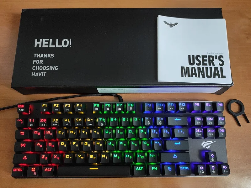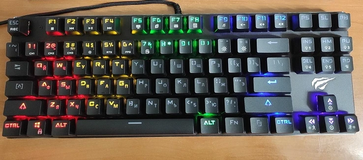 Доставка 14 дней до Вологды, от оплаты до получения. Заказывал из Китая, коробка с клавиатурой была обмотана двумя слоями пупырки, пришло целым, инструкция на русском языке. havit hv-kb432l Пользуюсь уже 2 недели, все кнопки работают без проблем. МИНУСЫ: отвратный шрифт, плохо понятен в целом, некоторых символов на цифрах просто невидно, прям новомодный маразм. Подсветка: английские буквы еще более менее нормально светятся, а вот с русским дела плохи, так как клавиши подсвечиваются сверху, русский текст подсвечен отчасти так как смешён в право и вниз. ПЛЮСЫ: RGB подсветка очень прикольная штука, можно настроить цвет каждой кнопки, для меня это была одна из главных причин покупки этой клавиатуры, да еще можно сохранить 5 настроенных режимов. Простота чистки. Клавиатура громче мембранки, нужно заказывать 2 комплекта колец. Красные свитчи для игр вполне нормально - проблем вообще нет, но для набора текста явно не лучший вариант.