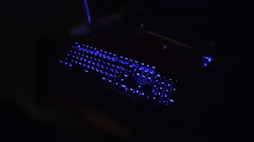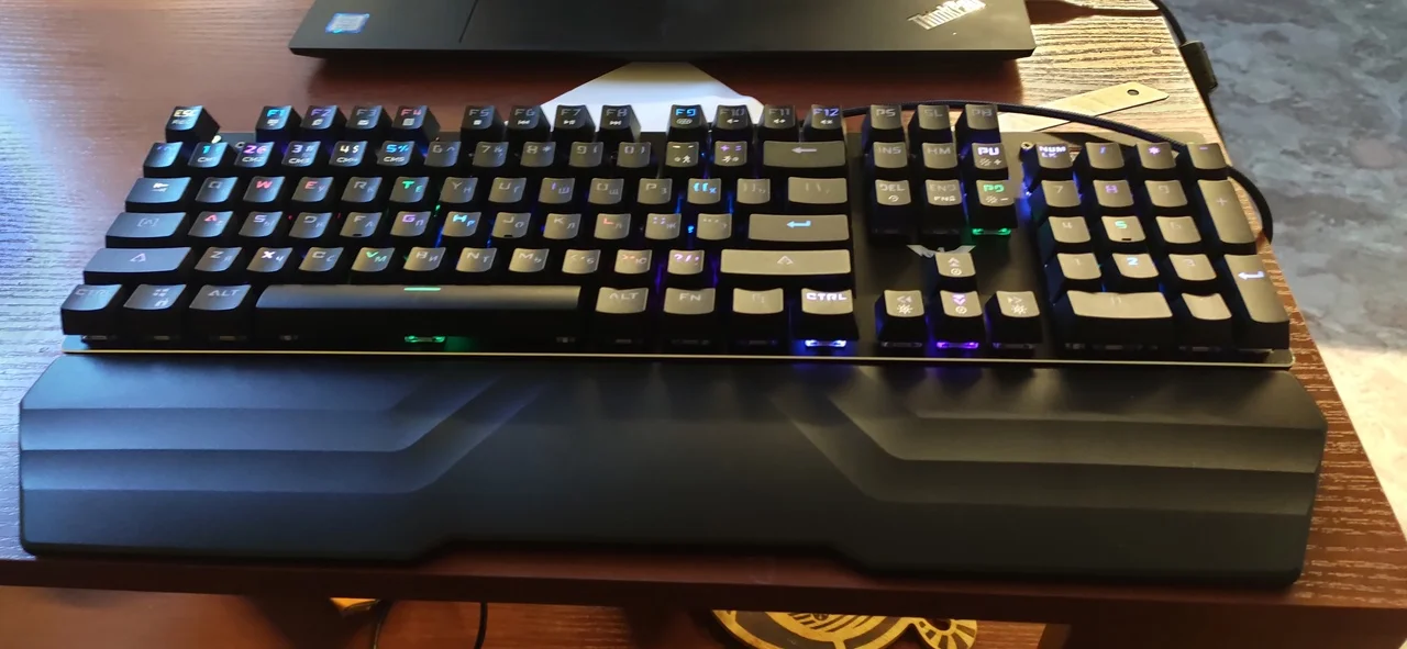 клавиатура довольно увесистая, можно будет пробить пару харь, светится, буквы видно нормально, подставка для запястья удобная, много режимов подсветки, но довольно шумная