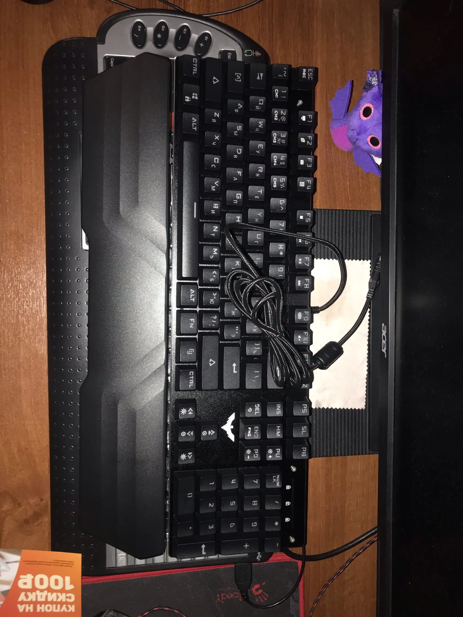 отличная клавиатура. с подсветкой русских символов. привезли домой курьером. доставка в Брянск меньше недели. не завышенная цена. скидка на 11.11 всего 100 р. но цена лучше чем у других со скидками в 50%) заказал не ожидая распродажи.