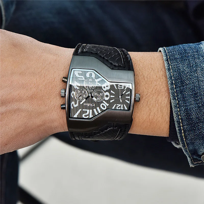 Часы Oulm Мужские с кожаным ремешком, роскошные брендовые кварцевые спортивные с двумя часовыми поясами, Прямая поставка