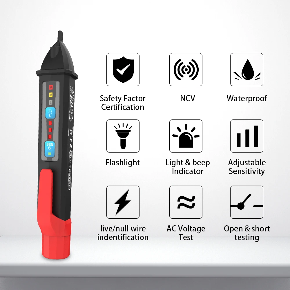 Вольт-Тестер соответствует CE CAT III 1000 В/CAT IV 600 В, а также оснащен звуковой и визуальной сигнализацией для обеспечения вашей безопасности.Примечание:Эта функция предназначена для определения напряжения в слабом электрическом поле.С функцией NCV можно обнаруживать объекты без напряжения переменного тока. В противном случае он обычно будет гудеть.Функция регулировки чувствительности решает слишком чувствительную проблему, как и другие тестеры напряжения. Когда тестер напряжения находится в ситуации по умолчанию, он может тестировать только 48-1000 В переменного тока, так что вам не нужно беспокоиться о шуме, когда вы кладете его в сумку или храните в месте, которое находится рядом с линией. Также можно проверить 12-1000 В переменного тока, настраивая кнопку «SEN»