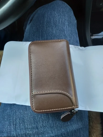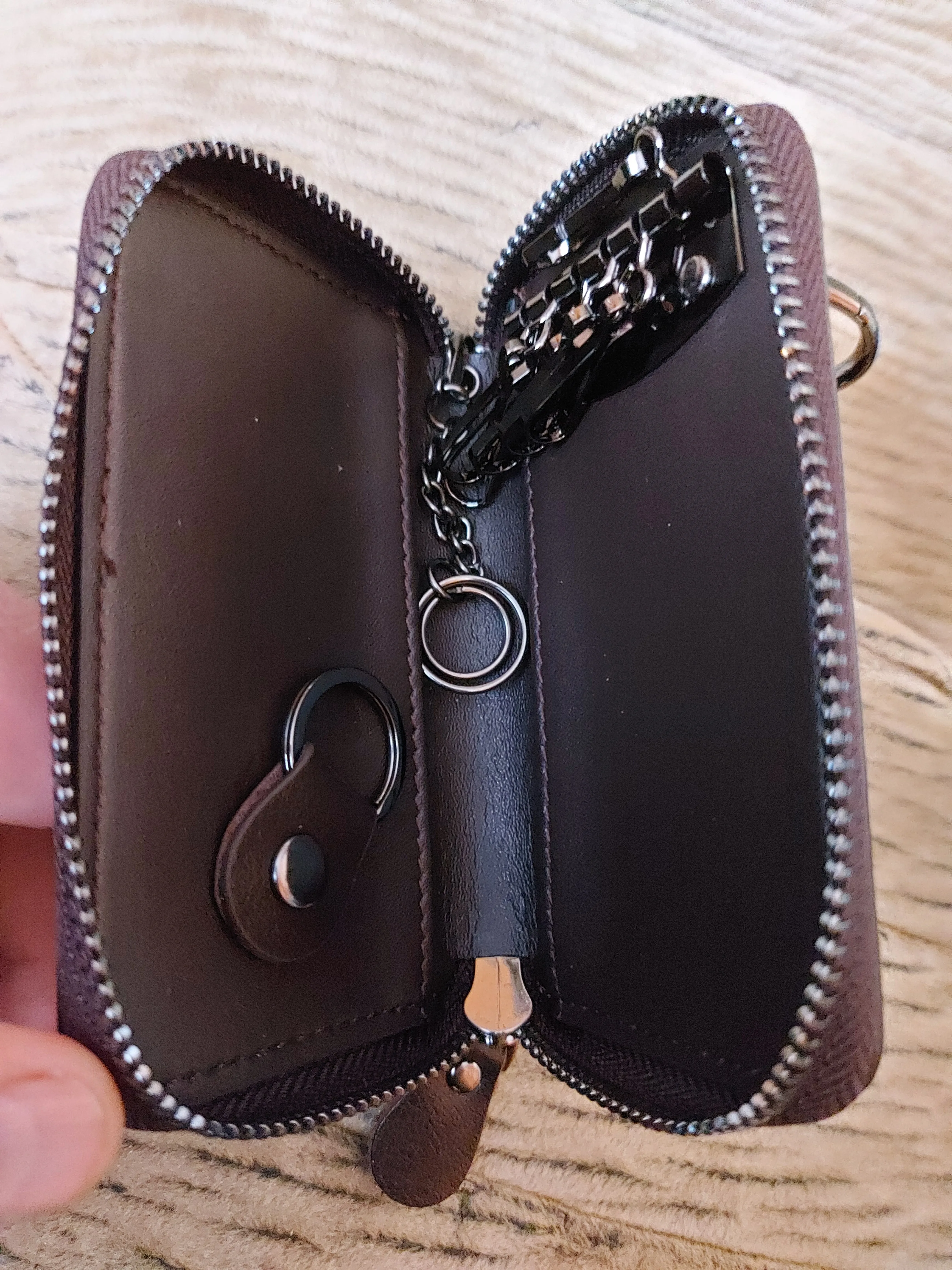 Ключница пришла за две недели. Качество замечательное! Фурнитура крепкая, качественная. Швы ровные, молния хорошая. Ключница держит форму, стенки плотные. снаружи и изнутри кармашки для карт. Цвет кофе очень темный. Только при дневном освещении понятен оттенок. Запаха неприятного нет. Очень рекомендую и товар и продавца!
