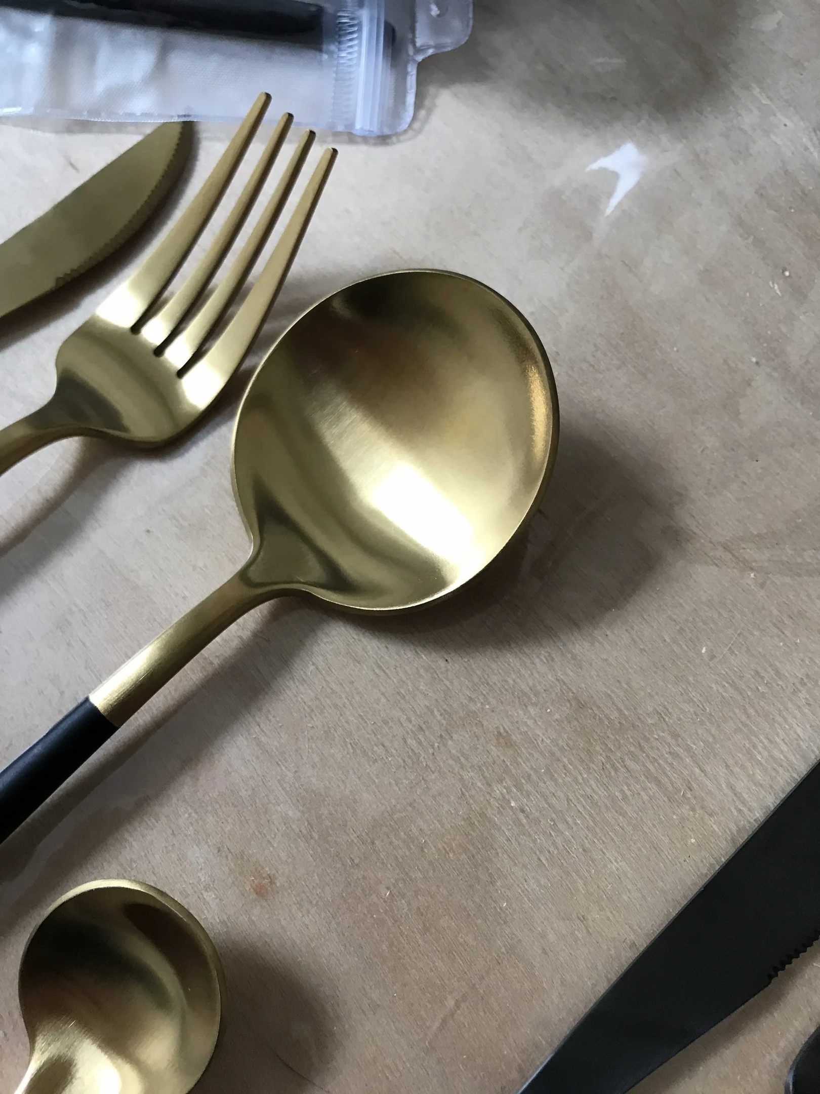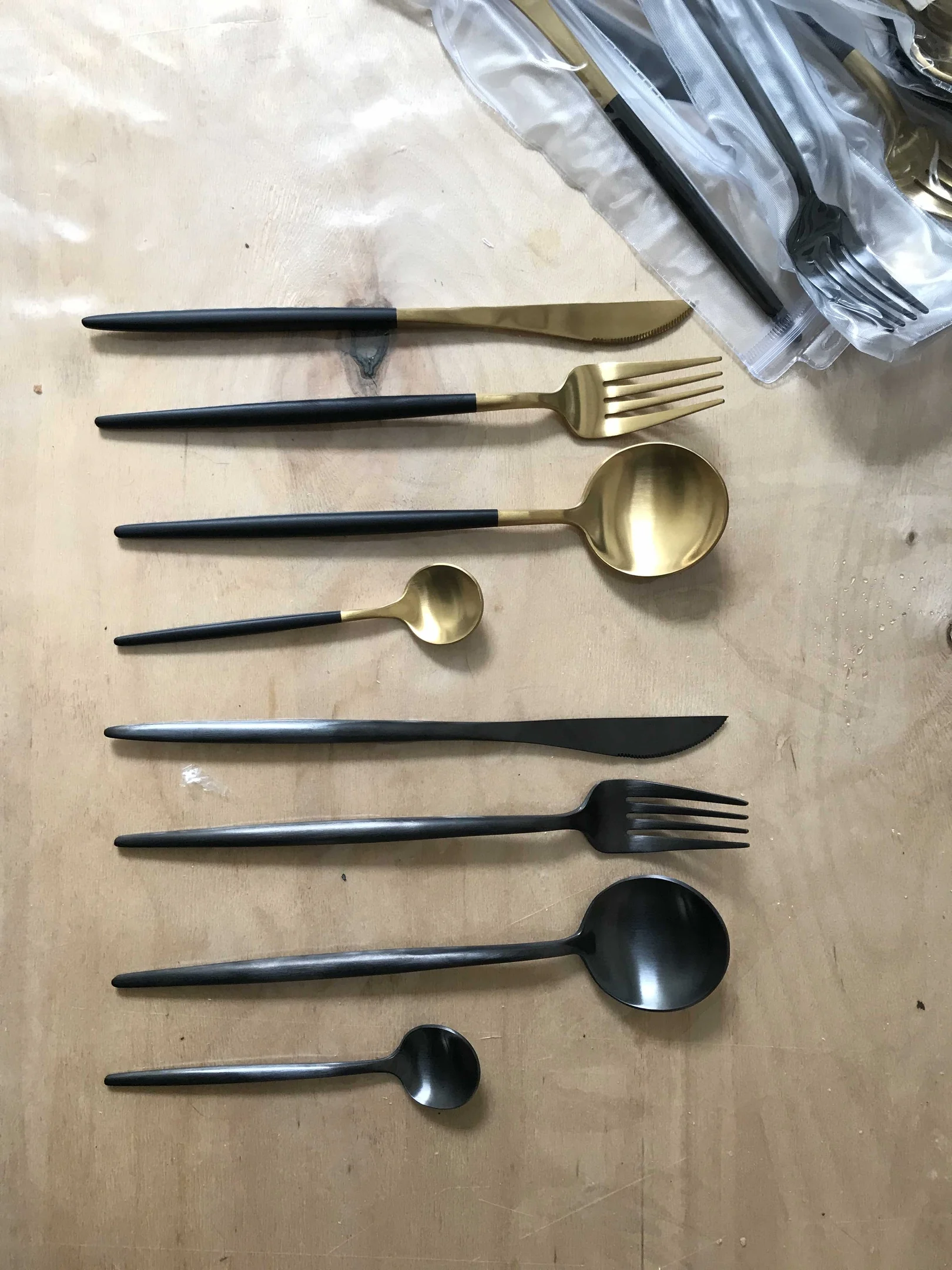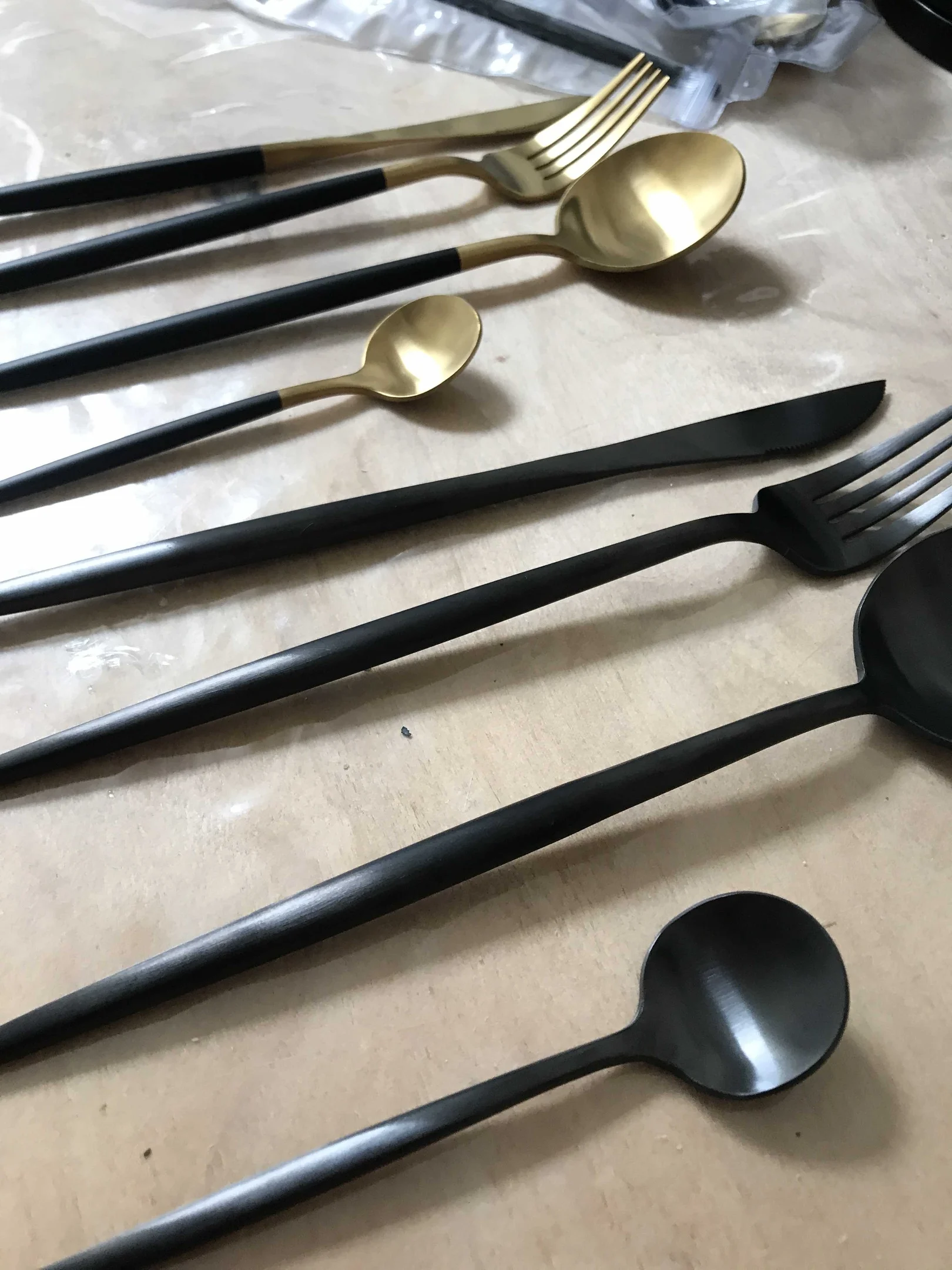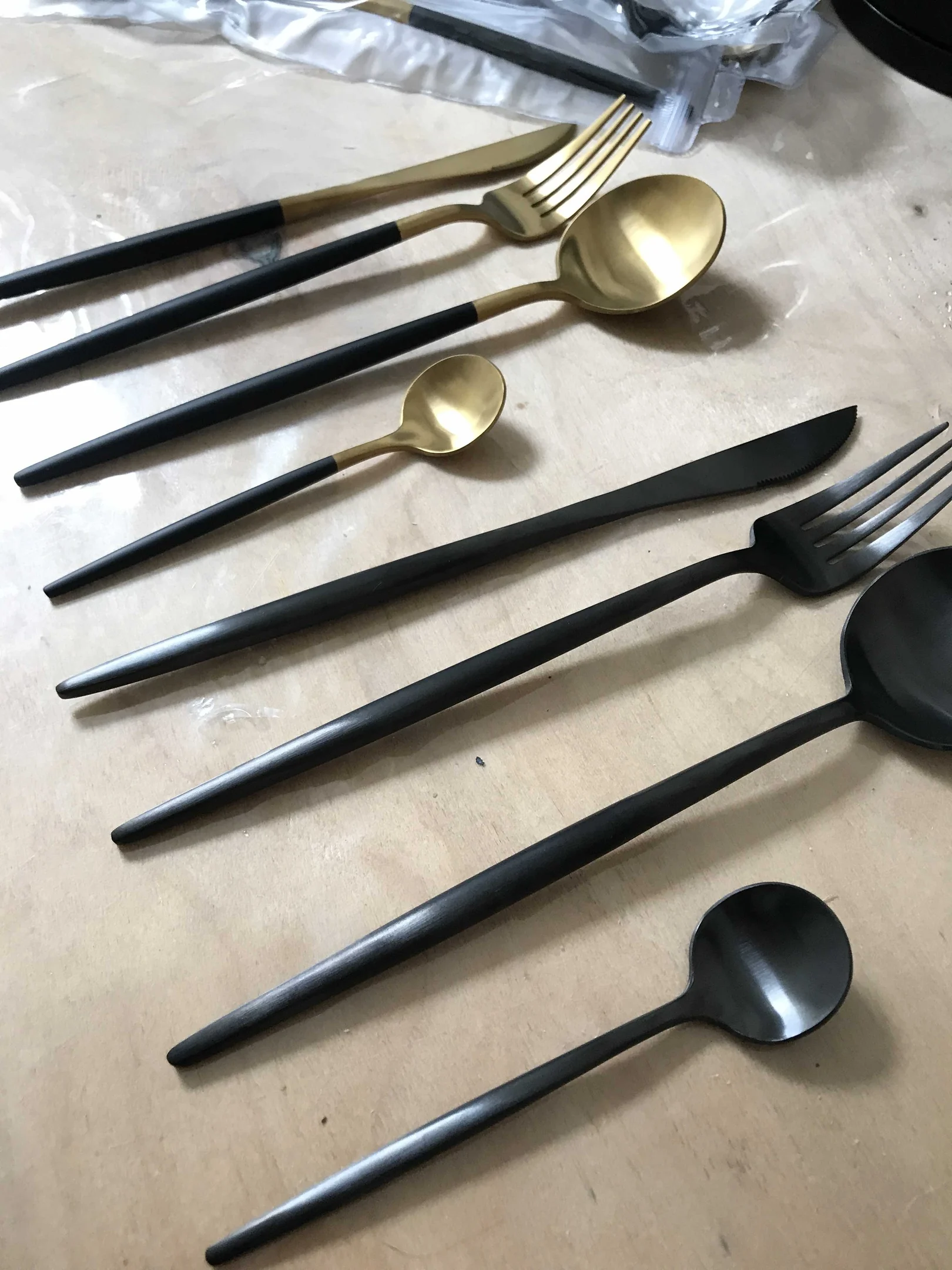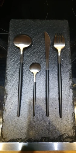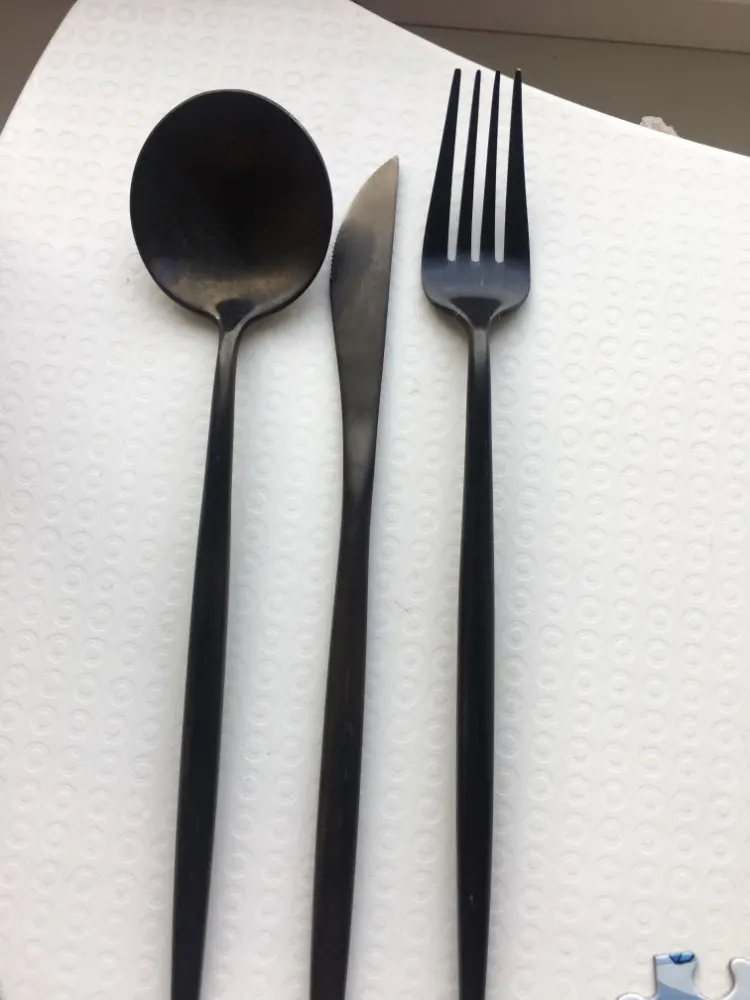Чёрные и стальные заказала, пришли очень быстро, за 4 дня. Приборы тяжелые, приятно держать в руке. Переживала , что ложкой неудобно будет кушать, но нет, всё удобно, вся семья опробовала и теперь закажу весь комплект
