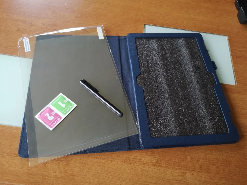 отличный набор, чехол идеально подошёл, удобный стилус, стекло в наборе защитное, но пока не устанавливали, быстрая доставка.