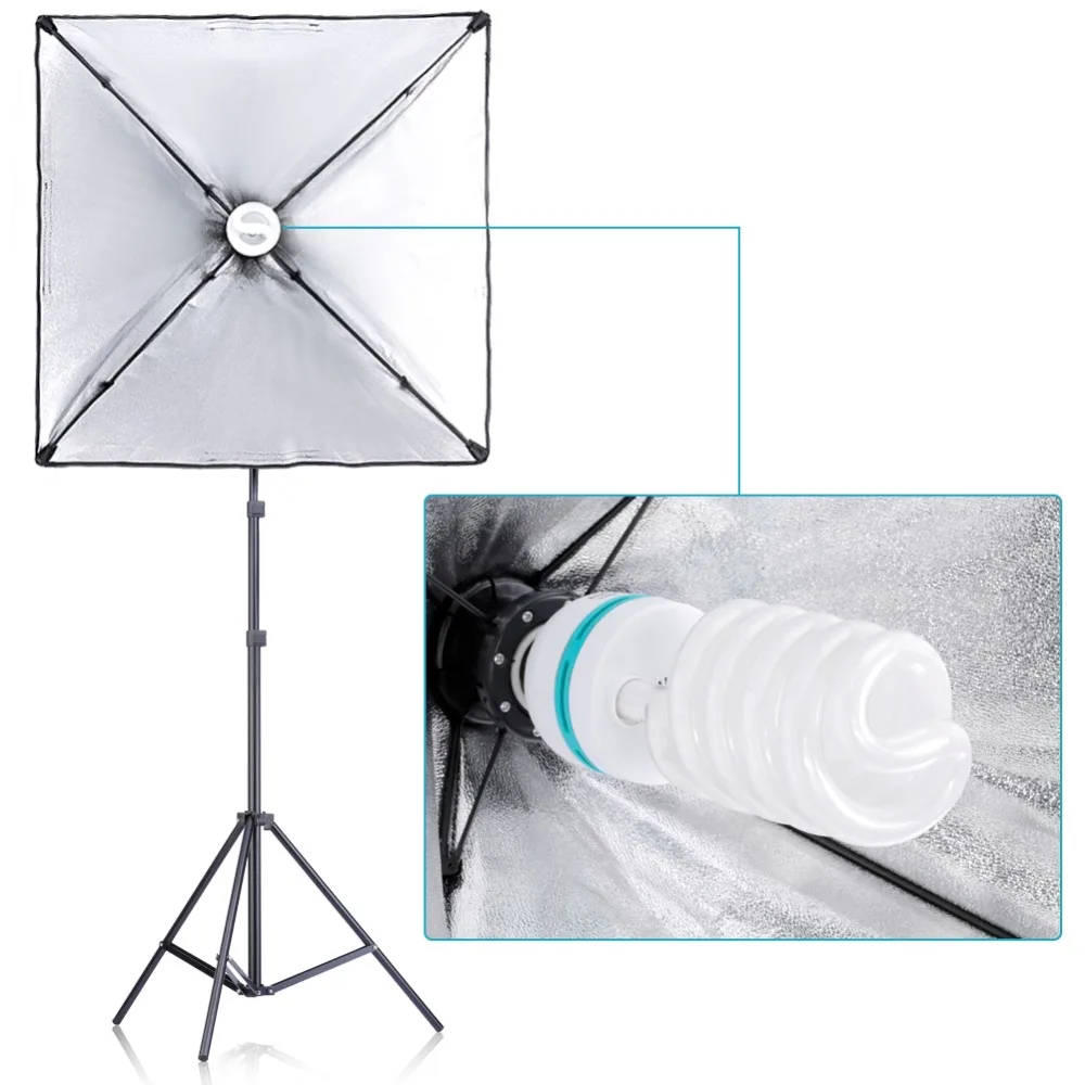 В комплект входит: (4)7 футов/200 см осветительная стойка +(2) держатель с одной головкой +(4) лампа дневного света 45 Вт CFL +(2)33 "/84 см зонтик +(2)24" x 24 "/60x60 см софтбокс +(1)3x3,6 м/10x12 футов Муслин Фон (черный, белый и зеленый) +(6) зажимные зажимы +(1) 2,6 м x 3 м/8.5ft x 10ft фон для фотографий с системой поддержки +(1) сумка для переноски для фоновой системы поддержки +(1) сумка для непрерывного освещения Легкая подставка и легкий держатель: прочная безопасная 3 ножки для стабильной и тяжелой работы. И используйте быстрые замки с одним действием, обеспечивая быструю точность регулировки высоты; Держатель с одной головкой позволяет прикрепить лампу к осветительной подставке и добавить зонтик Фон с изображением: Изготовлен из 100 муслин; Хлопчатобумажная ткань полотняного переплетения; Можно стирать в машинке; Легкая ткань; Не образует складок Белый полупрозрачный зонтик: белый зонтик смягчает, расширяет и рассеивает световой поток любого вольфрамового или студийного источника вспышки. Лампочки равны 200 Вт обычной выходной мощности лампы накаливания. Люминесцентная спиральная лампа 5500K создает близкое соответствие естественному дневному свету и более четкий вид освещаемых предметов Освещение софтбокса: софтбокс рассеивает свет и обеспечивает идеальное даже освещение, когда вам нужно для наилучших снимков. С гнездом E27, вы можете напрямую подключить лампочки, люминесцентные лампы, или slave flash, чтобы предложить свет