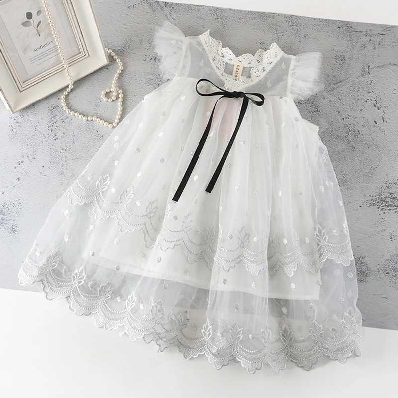 Кружевное платье с вышивкой и лентой для девочек, детские сетчатые ...