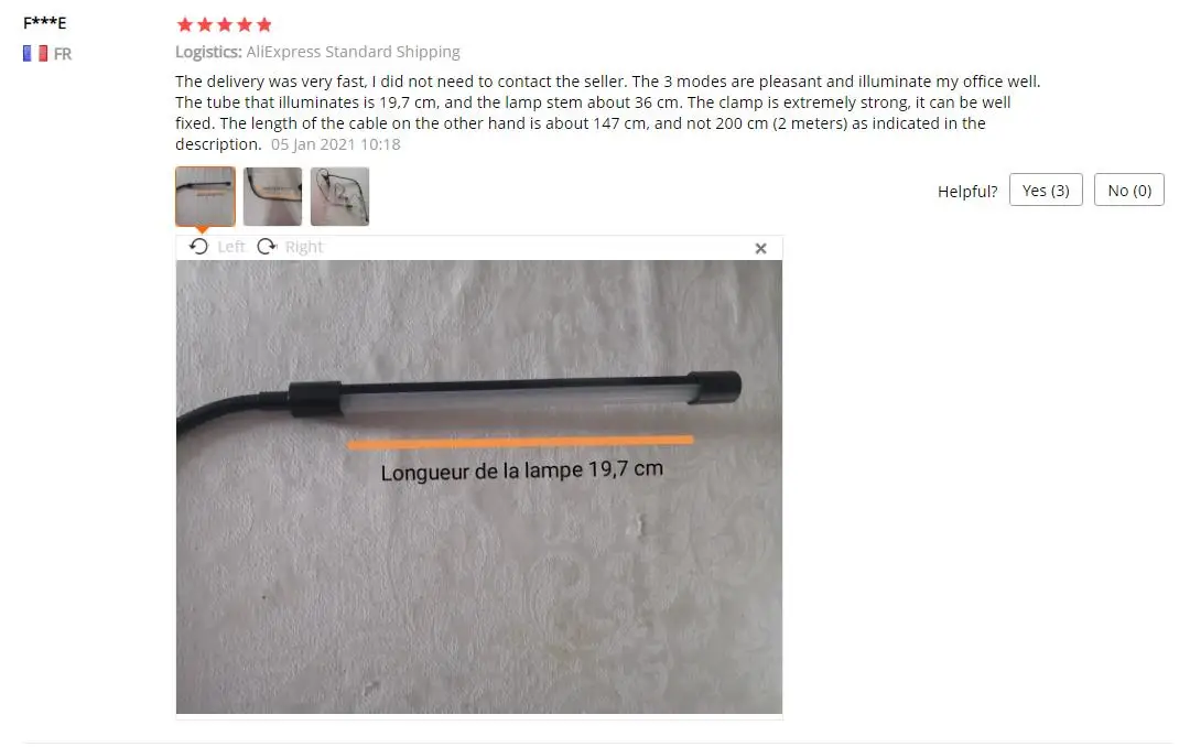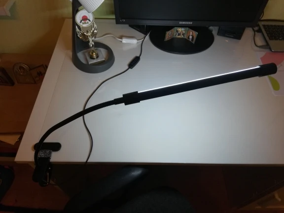Доставка была очень быстрой, мне не нужно было связываться с продавцом. 3 режима хороши и хорошо освещают мой офис. Трубка, которая загорается, составляет 19,7 см, а стержень лампы составляет около 36 см. Зажим очень прочный, его можно хорошо закрепить. Длина кабеля, с другой стороны, составляет около 147 см, а не 200 см (2 метра), как указано в описании.