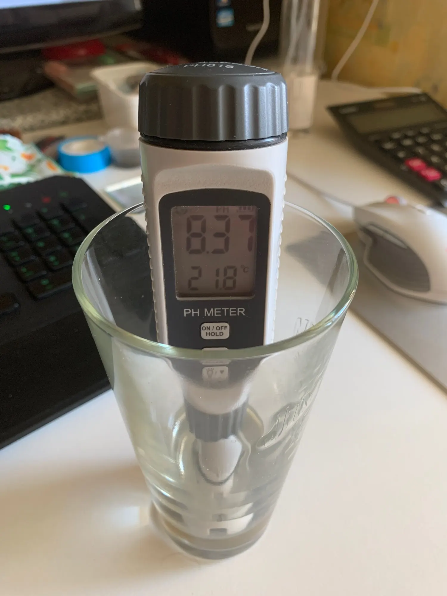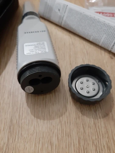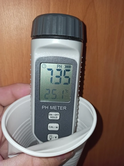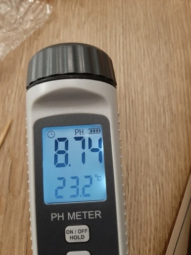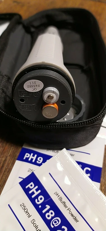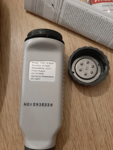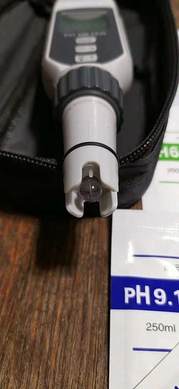 С момента заказа, до получения товара прошло около недели. Прибор доставлен без повреждений и в заявленной комплектации. Питание - 2 батареи ААА. Перед использованием устройство нужно осторожно встряхнуть и придать рабочее положение на некоторое время, чтобы электролит перетëк в сферу и заполнил еë - это если его там не видно. Сам прибор хорошо сделан. Отзывается на кнопки и выполняет все функции. В колпачке электрода влажная целлюлозная губка, на уплотнении колпачка кристаллы соли что говорит о наличии следов раствора для хранения. Изменения pH буферных растворов показало НЕсоответствие значений, после калибровки прибора был измерен pH аквариумной воды и отмечено близкое соответствие показания устройства с результатами капельных тестов. Также был измерен pH буферных растворов после калибровки - разница показаний прибора и заявленного значения pH может составить 1 - 2 сотых, я считаю, это неплохо. Продавец охотно ответил на мои вопросы. Прибор меня устраивает. Я доволен сделкой.