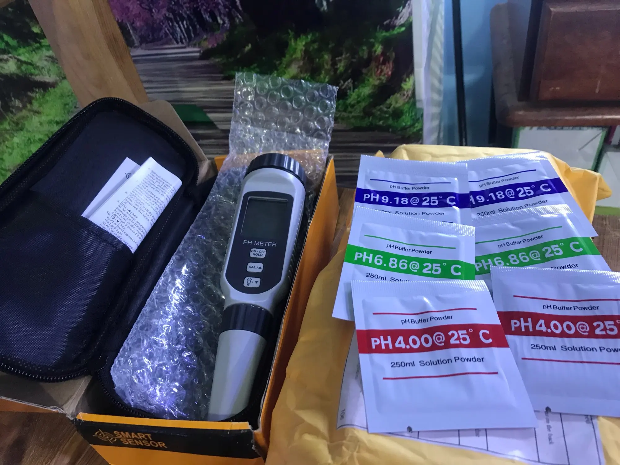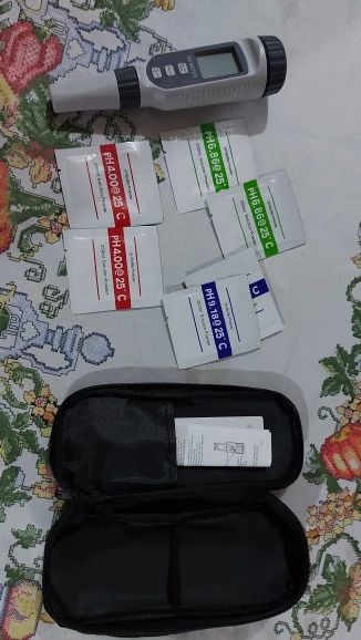 O produto chegou bem antes do previsto, está totalmente conforme o anunciado. Com uma capa plástica e soluções de ajustes do PH, mas sem as duas baterias AAA. Não testei ainda todas as funcionalidades, mas coloquei as baterias e ligou adequadamente e já medindo a temperatura ambiente.