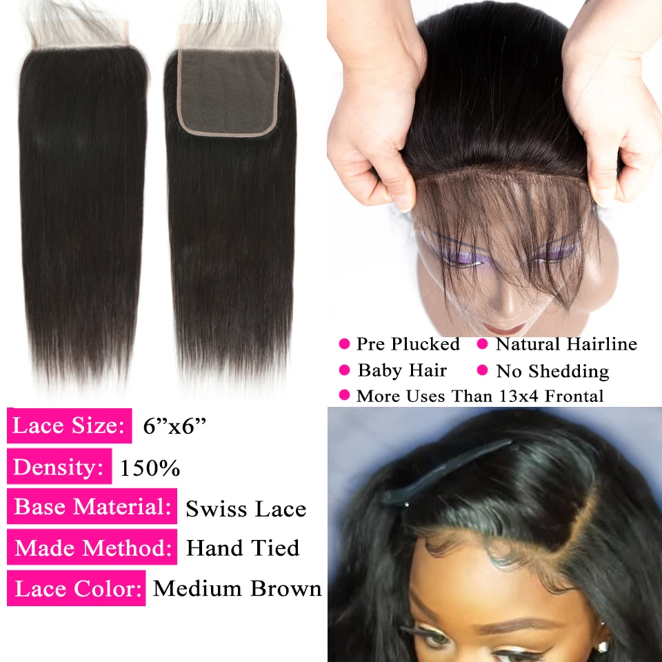 Пряди натуральных волос на сетке, 4x4, 5x5, 6x6, 6x6, с прядями прямых бразильских волос 13x4, 3 пряди с застежкой