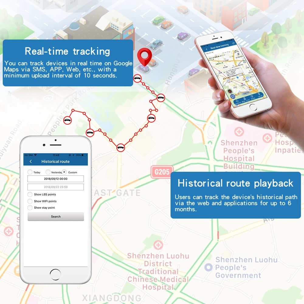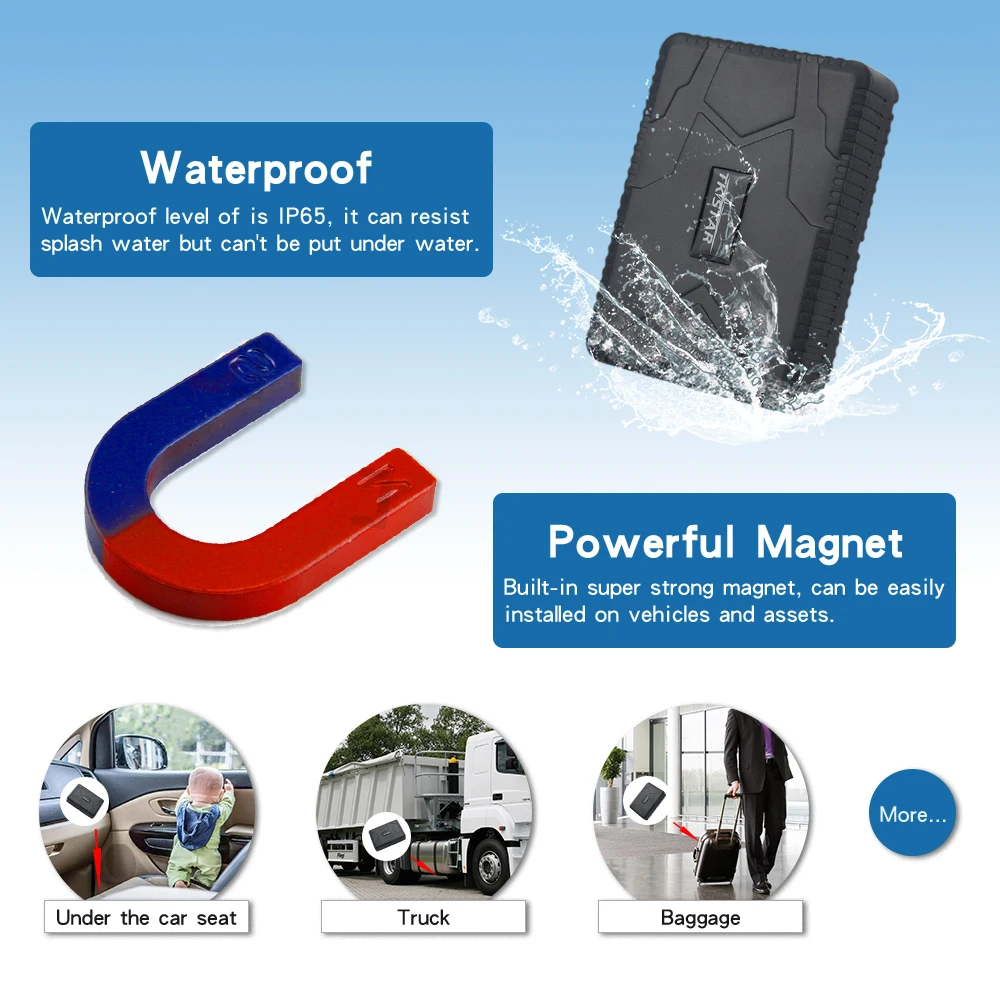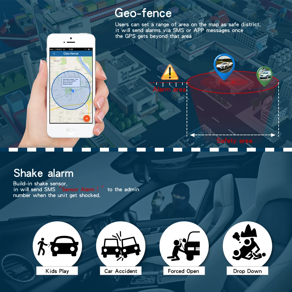 1.Длительное время работы в режиме ожидания: Встроенный 3,7 В10000 мАчЛитий-ионный аккумулятор, может работать в режиме ожиданияДо 120 дней. 2.Мощный магнитный: Он имеет 6 встроенных магнитов, с супер сильным мощным магнитом, может быть очень легко установлен. 3.Удаленный голосовой монитор: Сначала отправьте «монитор + пароль» на устройство, затем устройство превратится в режим монитора, теперь, если вы позвоните на номер sim-карты на устройстве, он будет принимать Ваш вызов автоматически, и вы сможете контролировать голос вокруг устройства! 4.Сверхскоростная сигнализация: Этот будильник работает только в режиме непрерывного позиционирования. Когда скорость устройства превышает скорость, которую вы указали, он отправит сообщение «сигнал скорости!» на номер admin каждые 5 минут. 5.Сигнал тревоги: После того, как вы сделали настройку будильника, пожалуйста, держите трекер неподвижным в течение 5 минут, тогда эта функция начнет работать. Он отправит SMS «датчик тревоги!» на номер admin, когда устройство будет в шоке. 6.Режим сна: * Режим сна в зависимости от времени: после этого трекер будет работать только в течение 5 минут после пробуждения и возврата в режим сна, GPS отключится, и GSM будет работать в режиме низкого потребления. SMS, звонок может разбудить трекер. * Режим сна с помощью датчика удара: после этого настройки, если нет шока в течение 5 минут, трекер будет работать под режимом «Сон шоком», GPS отключится, GSM будет работать при низком потреблении. Вибрация, SMS, звонок может разбудить трекер. 7.Воспроизведение маршрута истории: Вы можете отслеживать маршрут истории устройства до 6 месяцев через веб-платформу и приложение! 8.Пожизненная Бесплатная веб-платформа отслеживания иОтслеживание мобильных приложений Android/IOS:Нет никакой годовой подписки